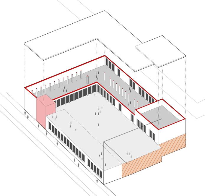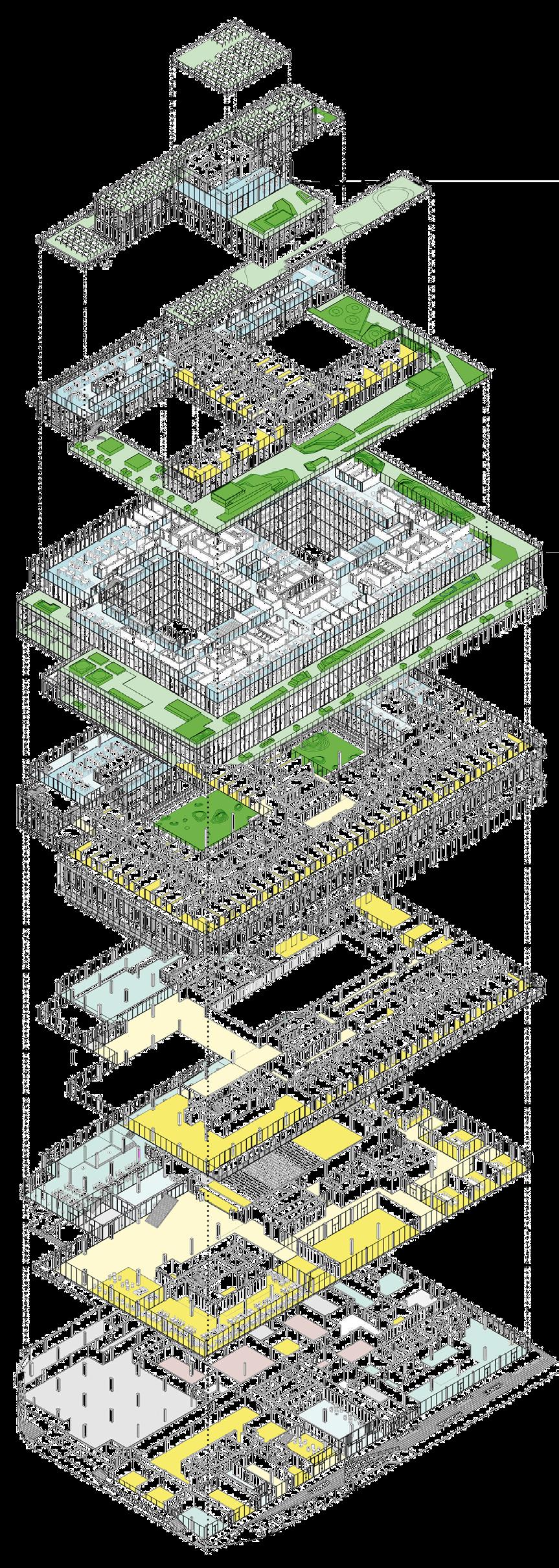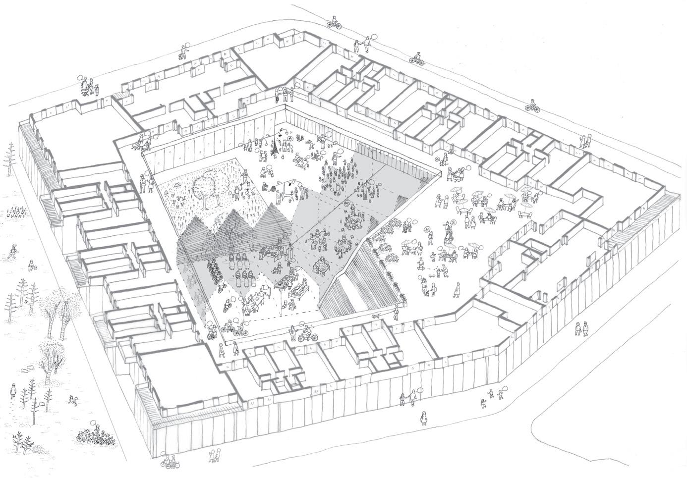 Au nord, un deuxième bloc urbain triangulaire, plus polyvalent, comprend des résidences étudiantes, un parking sur plusieurs étages, des bureaux et un centre sportif aux étages supérieurs.