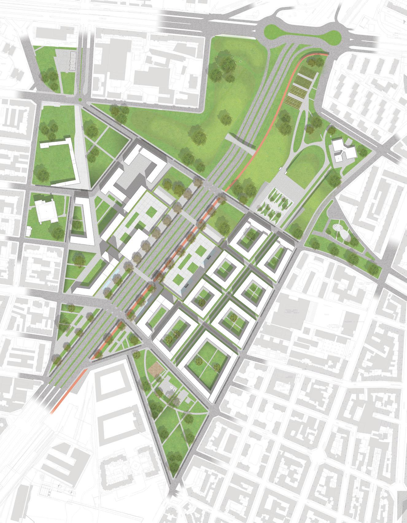 La nécessité d’un grand boulevard central planté de liaison directe nord-sud de la ville et un nouveau parc urbain sont les deux enjeux principaux du projet. Le nouveau parc, au nord du site, comprend des espaces pour le loisir et le sport. Le cœur du projet se compose de deux grandes places entourées d’arcades rectangulaires, adjacentes au boulevard central. L’arcade, signe de l’identité de Turin, est l’élément unificateur des deux places qui sont séparées par le boulevard central.