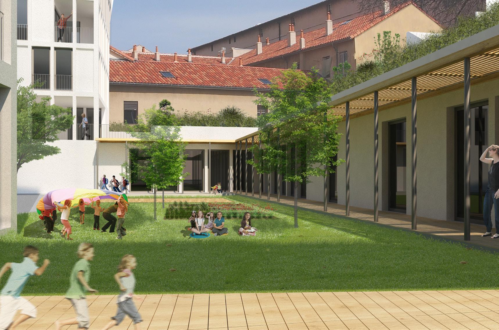 Le bâtiment de forme pentagonale prend en compte le mouvement du soleil au cours de l’année. La cour intérieure abrite une aire de jeux en plein air pour les enfants de la crèche et un espace de partage pour les habitants.