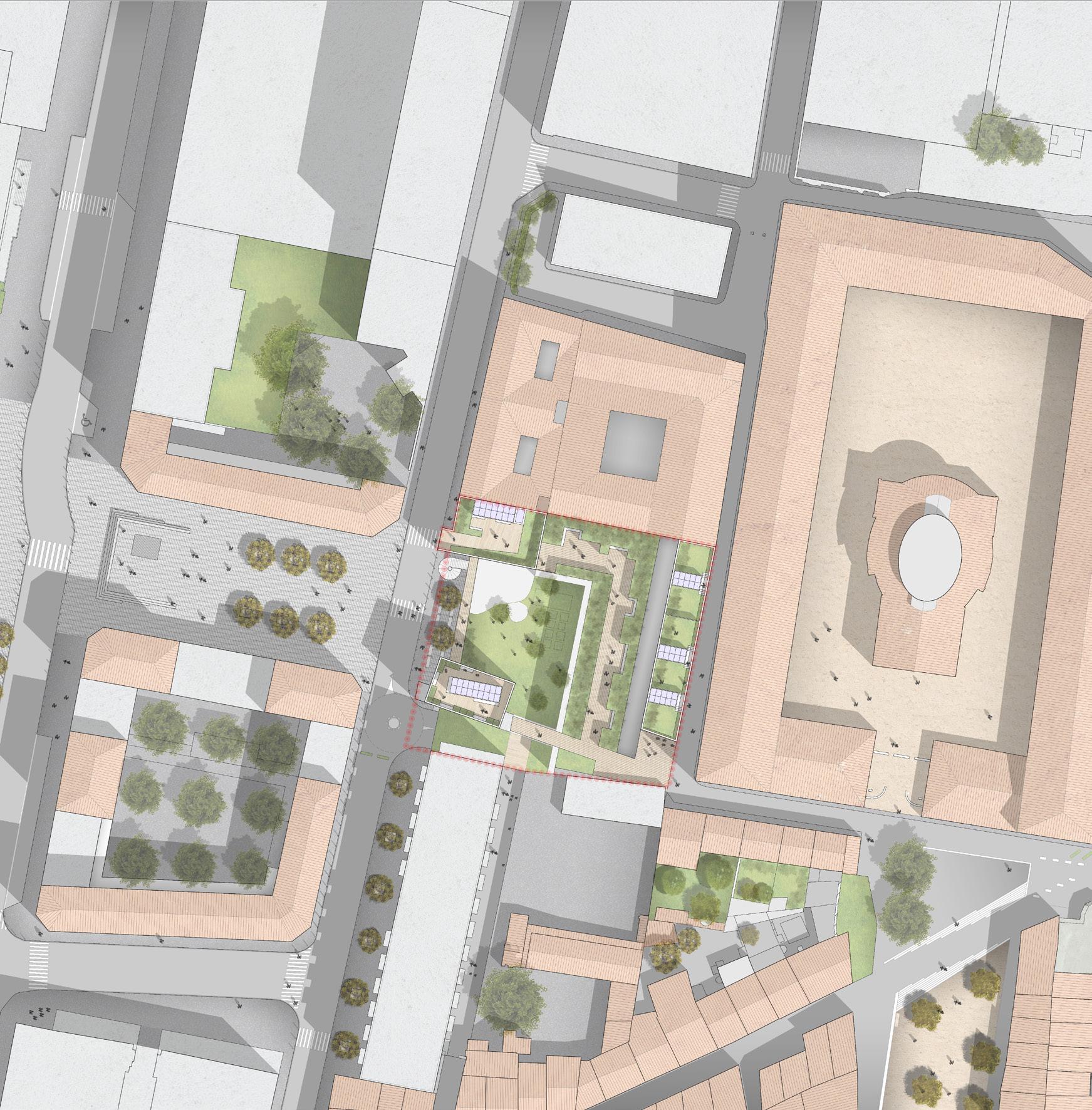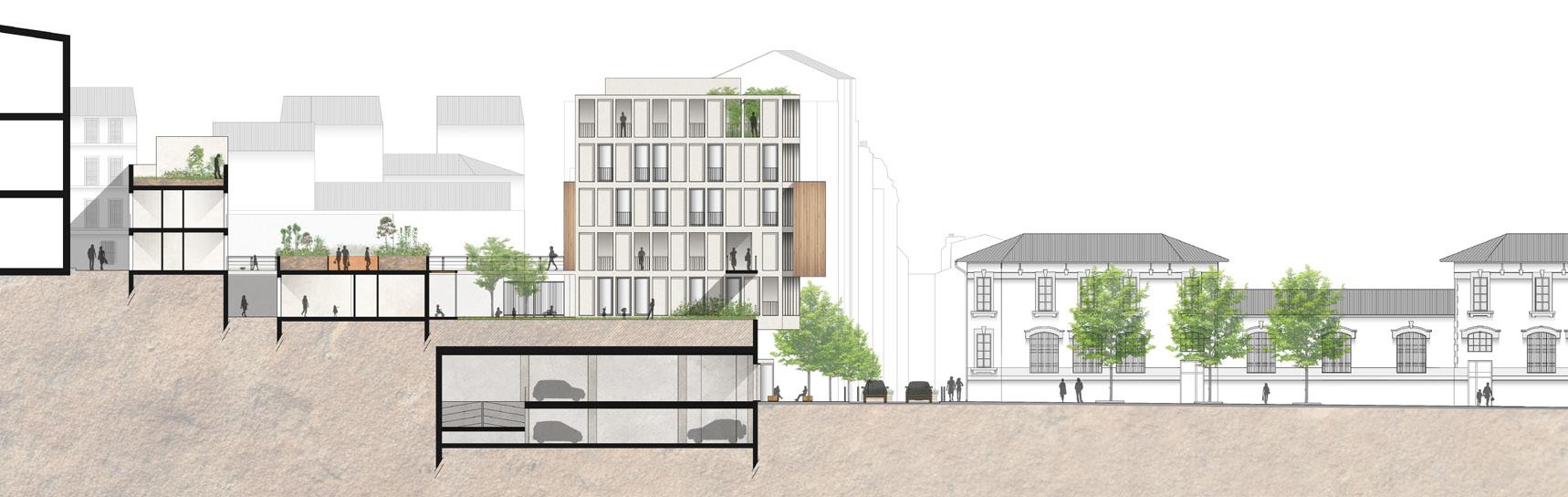 Le projet permet la liason directe vers le Panier et la création d’un nouvel espace public. La fonction de parking est la vocation première du projet, mais dans le même espace ont également été conçus une crèche et un passage vert public pour les visiteurs et les habitants du quartier.