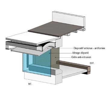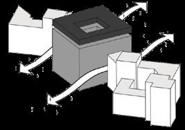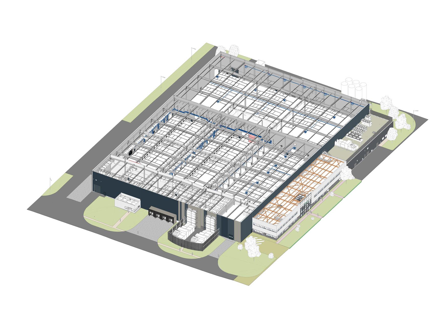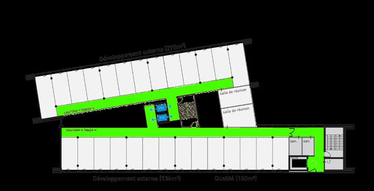 bâtiments industriels à sheds. Ces derniers éléments permettent l’entrée de la lumière zénithale sur toute la longueur du bâtiment. Dans le deuxième bâtiment, la logistique, la demande de stockage et d’ateliers privilègie le choix d’une structure en charpente métallique à grande portée. Afin de « masquer » l’ensemble des bâtiments, un écran végétal en talus protège la plupart du site des regards extérieurs.
