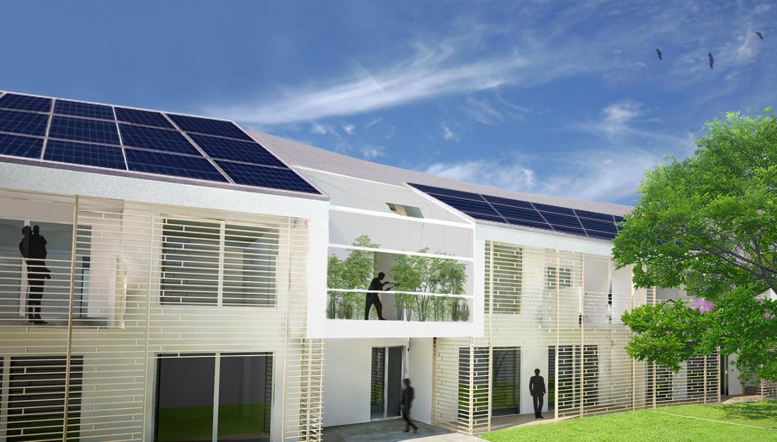 de construction en panneaux portants “X-lam”. Le choix des matériaux a été fait en référence à l’impact environnemental dans l’ACV de chaque matériau utilisé. L’utilisation de technologies pour l’exploitation des ressources renouvelables et l’utilisation de techniques permettant de réduire la consommation d’énergie sont deux autres points principaux du projet.