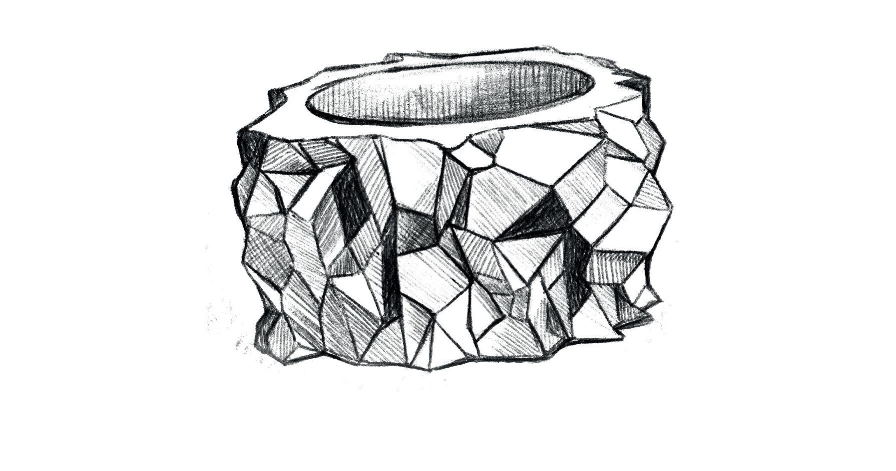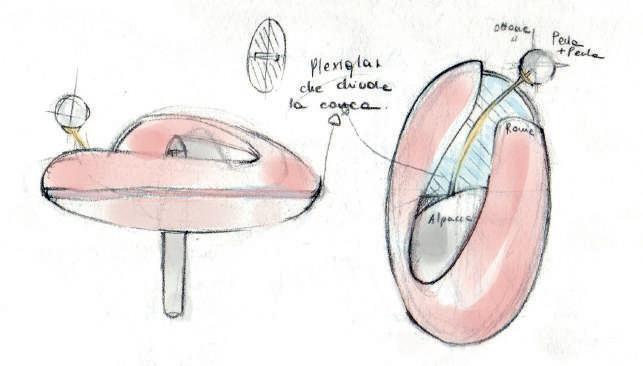 Disegno ideativo a penna e grafite con tecnici relizzati dopo la realizzazione del modello 3D.