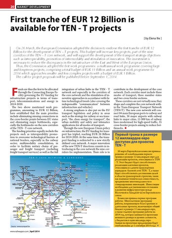 Первый транш в размере 12 миллиардов евро доступен для проектов TEN - T 26 марта Европейская комиссия приняла решение об освобождении первого транша в размере 12 миллиардов евро для реализации проектов, относящихся к TEN - Т. Этот бюджет будет способствовать реализации ключевых проектов, относящихся к девяти транспортных коридоров базовой сети TEN - Т, а также будет способствовать достижению целей в области транспортной стратегии, таких как взаимная техническая совместимость, продвижение многомодальности и стимулирование инноваций. Инвестиции необходимы для уменьшения отставания в развитии инфраструктуры между Восточной и Западной части Европейского союза. Комиссия приняла первые программ работы: Многолетнюю программу работы, покрывающую более крупные и длительные проекты, включающую общий бюджет в размере 11 миллиардов евро, а также годовую программу работы на 2014 год, которая занимается проектами меньшего размера и уровня сложности, с бюджетом в один миллиард евро. Заявки на проектные предложения будут опубликованы до 1 сентября 2014 года.