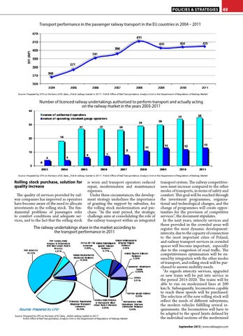 transport system. The railway competitiveness must increase compared to the other modes of transports, in terms of safety and comfort. This goal will be reached through The quality of services provided by railthe investment programmes, organisaway companies has improved as operators tional and technological changes, and the have become aware of the need to allocate change of programmes will create opporinvestments in the rolling stock. The funtunities for the provision of competitive damental problems of passengers refer services”, the document stipulates. to comfort conditions and adequate serIn the next years, intercity services and vices, and to the fact that the rolling stock /Source: Prepared by UTK/ those provided in the crowded areas will The railway undertakings share in the market according to The railway undertakings share in the market according to the transportregister the most dynamic development: the transport performance in 2011 intercity, due to the capacity of connection performance in 2011 to the most important cities 36 of Poland, Koleje Wielkopolskie PKP S zybka Kolej and railway transport services in crowded A rriva RP / DB Koleje Dolnośląskie (Greater Poland M iejska w Trójmieśc ie Railway) S c henker (PKP Fast Urban Rail in (Lower S ilesian spaces will become important, especially 0,48% 0,09% Railway) Tri-c ity) PKP Interc ity due to the congestion of road traffic. The 0,17% 4,97% 45,52% Koleje Ś ląskie (S ilesian competitiveness optimisation will be enKoleje M azowiec kie Railway) (M azovian Railway) 0,30% sured by integration with the other modes 10,34% of transport, and rolling stock will be purUsedomer Bäderbahn chased to answer mobility needs. GmbH “As regards intercity services, upgraded 0,004% or new trains will be put into service in others the period 2015-2020. The trains will be 0,01% able to run on modernised lines at 200 km/h. Subsequently, locomotives capable to reach these speeds will be purchased. narrow gauge railway 0,03% The selection of the new rolling stock will S zybka Kolej M iejska reflect the needs of different 21 subsystems, Przewozy Regionalne Warszawska Kolej w Warszawie (Fast (Regional Transport Dojazdowa (Warsaw Urban Rail in Warsaw) the modern vehicles fulfilling several rec ompany) Commuter Railway) 0,95% 36,53% 0,63% /Source: Prepared by UTK/ quirements: the locomotives will have to be adapted to the speed limits defined by Source: Prepared by UTK on the basis of EC data , „Polish railway market in 2011”, the individual sections of the modernised Polish Office of Rail Transportation, Analysis Unit in the Department of Regulation of Railway Market is worn and transport operators reduced repair, modernisation and maintenance expenses. Under these circumstances, the development strategy underlines the importance of granting the support by subsidies, for the rolling stock modernisation and purchase. “In the next period, the strategic challenge aims at consolidating the role of the railway transport within an integrated