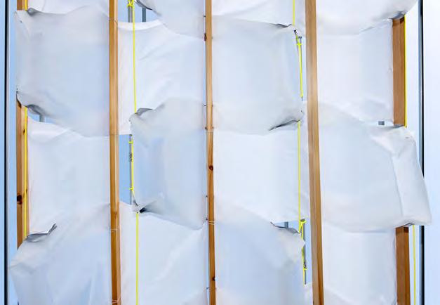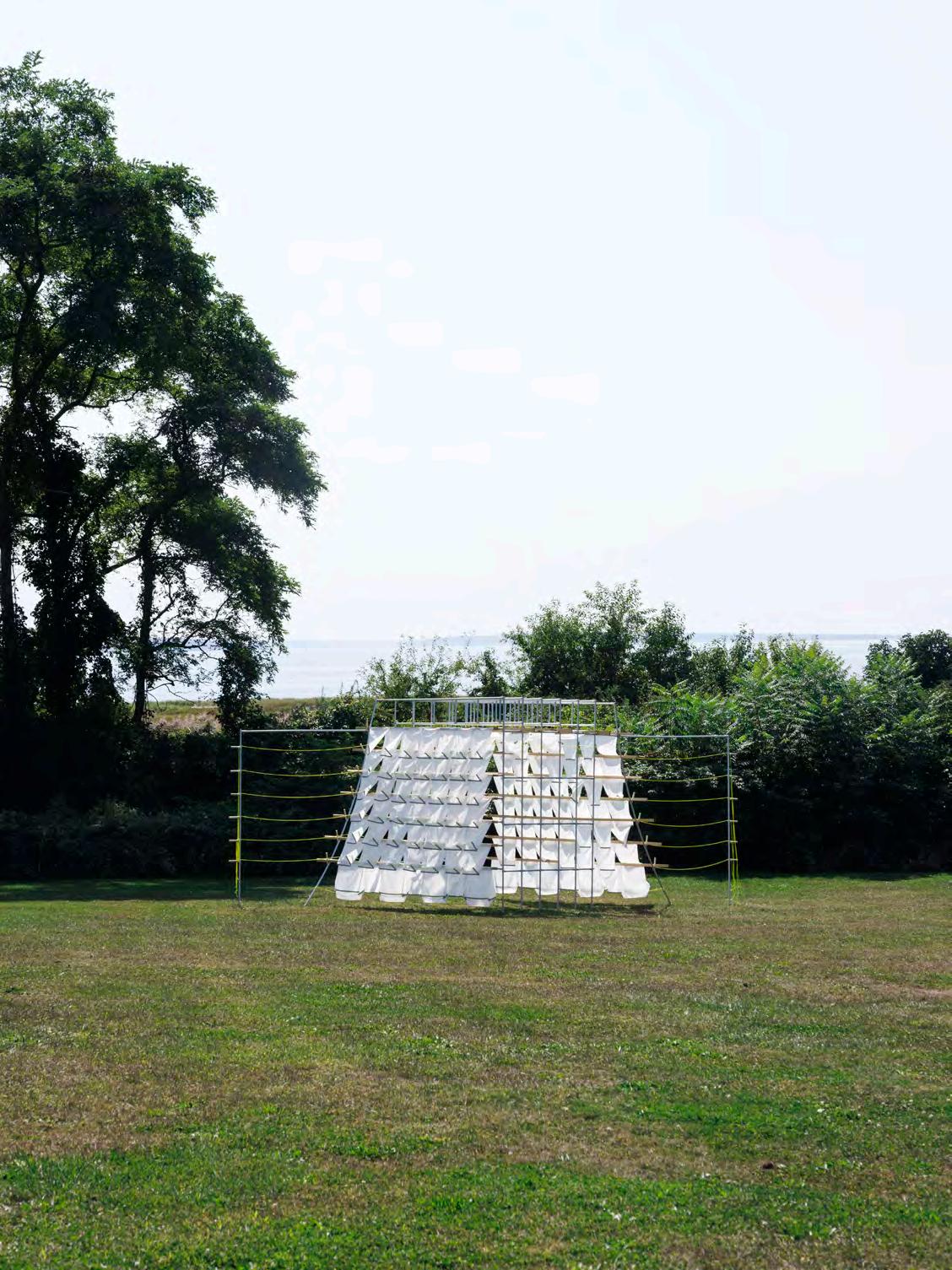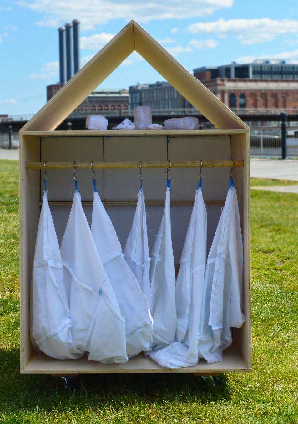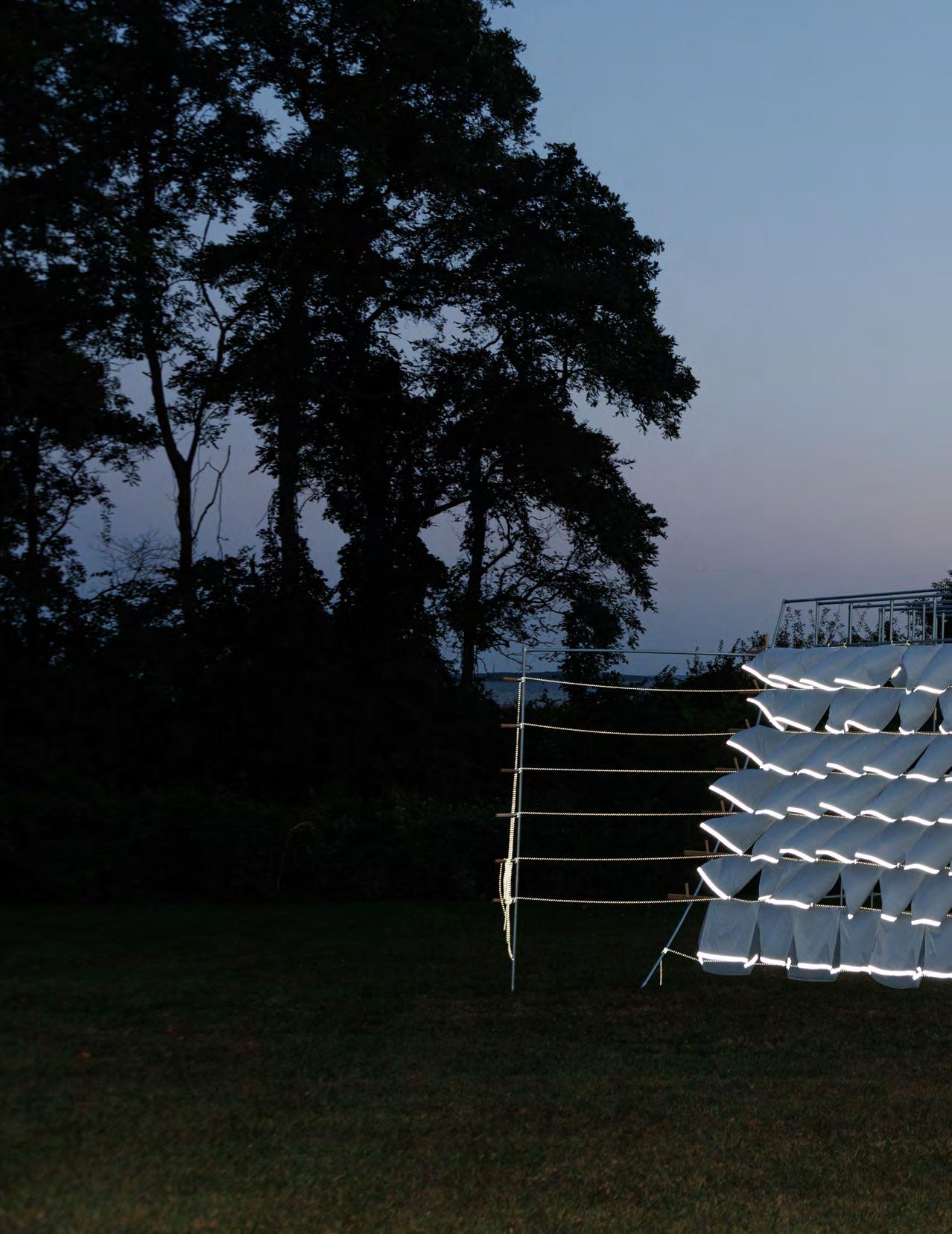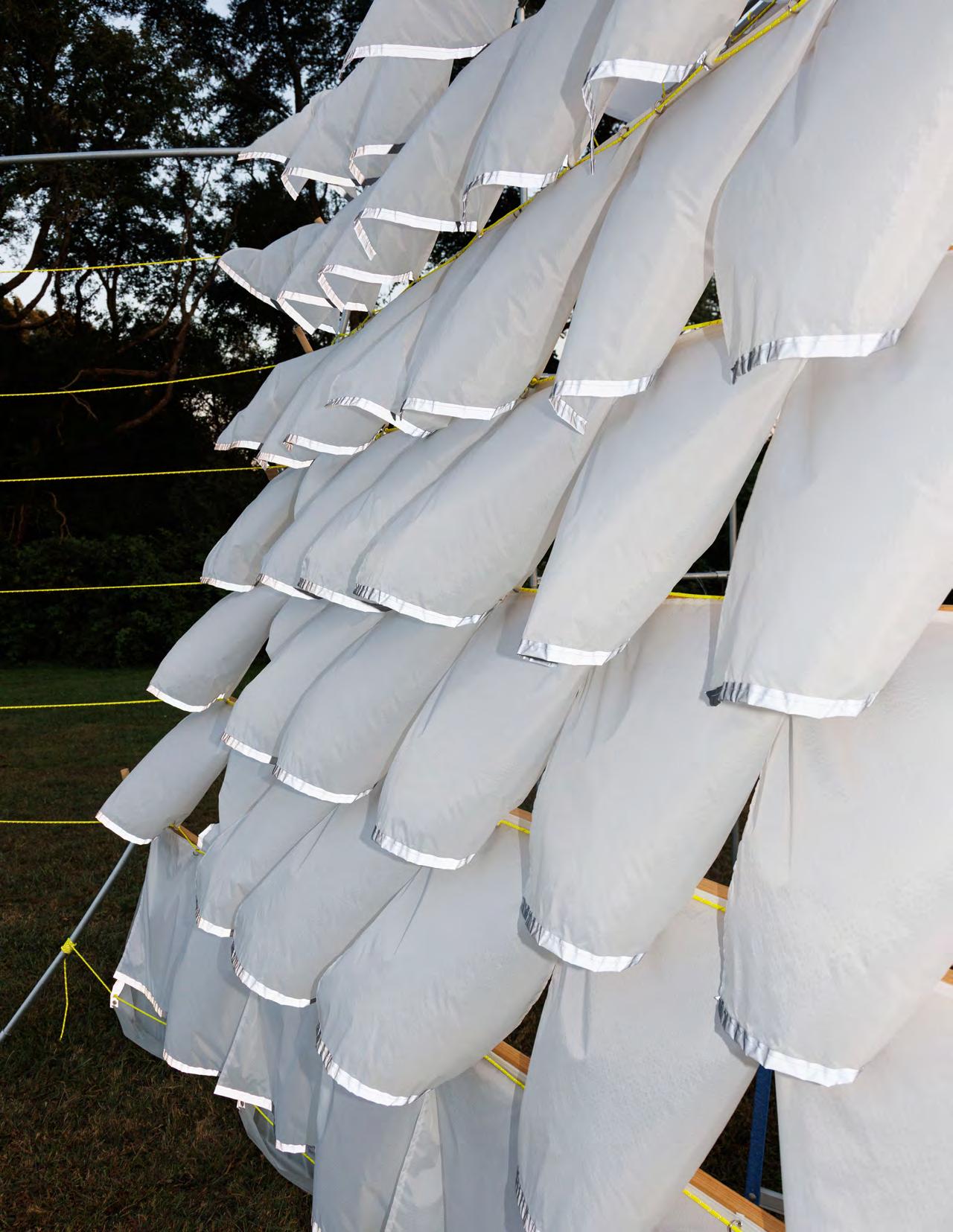 “What if our buildings ... engaged with the perpetual act of catching water? ... The project proposes a water-collecting structure with a soft, intermediary touch. Constructed at Tillinghast Place, the fabric-shingle pavilion is equally concerned with shedding moisture as it is with harvesting it. The shingles dance in the wind, directing rainwater into modest catchment pouches. Eschewing efficiency for delight, the water pavilion holds just enough water, for just long enough, a reminder that burden and bounty are held in balance.”