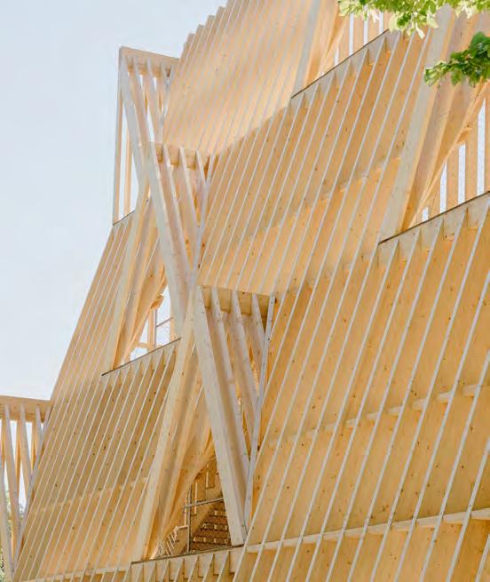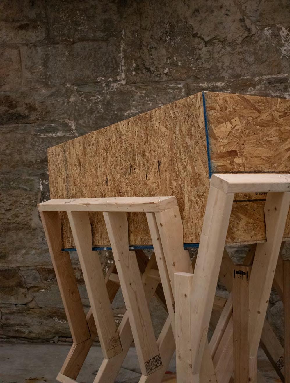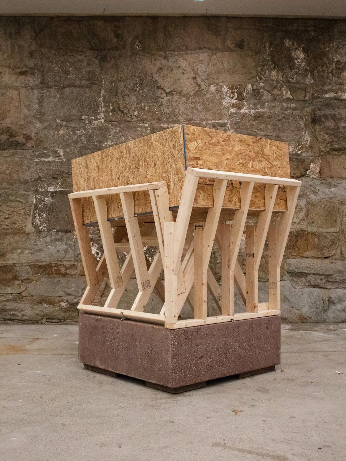 Using the 2021 American Framing pavilion as a point of departure, Good / Poor engages with familiar light-frame wood construction elements— wall panels, bridging, birdsmouth notches— and recombines them into unconventional configurations. By contrast to the inexact nature of wood framing, the precision of a CNC router allows for customized angles and dimensions at each point of connection. Visibly poor construction methods achieve surprising stability due to this insertion of hyper-precise technology into an approximate practice, challenging rigid definitions of “best practice” in wood-frame construction.