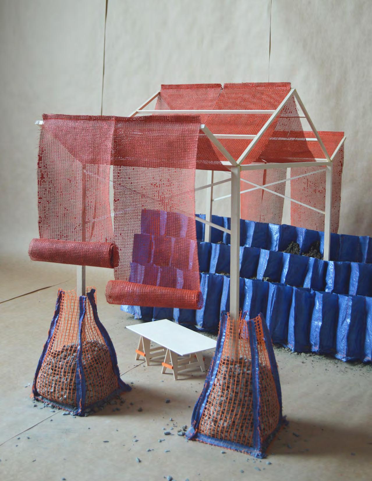 The components of Ground Unit are conceptualized as a kit of parts to be deployed as the opportunity arises. It includes the soil-filled tarp retaining wall, aggregate-filled gabion column, veiled canopy structure, and informal furniture.