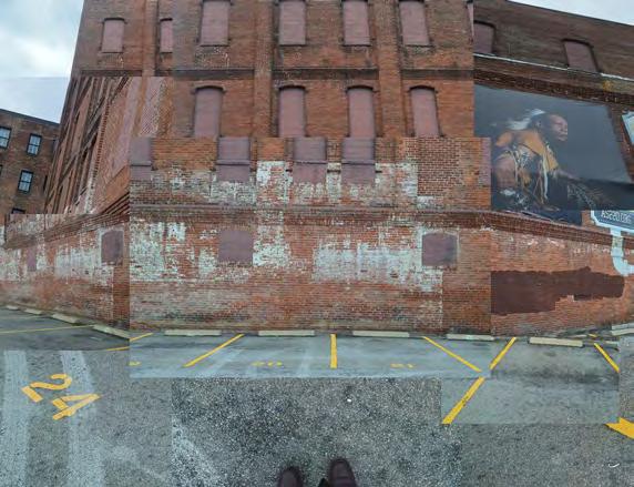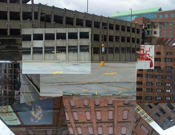 Joiner photo collages draw attention to the rich textural qualities of brick and fortress-like character of the surrounding buildings. The location poses a challenge: to engage with the impenetrable language of Providence’s existing fabric, yet be inviting to members of the public. Large openings break up heavy exterior walls, teasing visual access from the street.