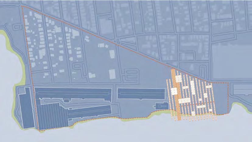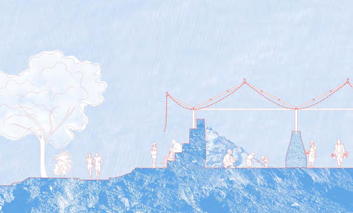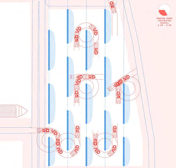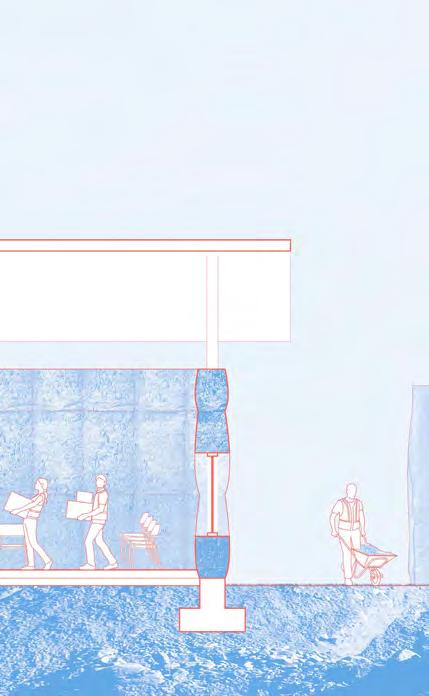 Buildings are interspersed between these whose layout is determined by the heavy machinery frequently circulating through the Informal program like open-air markets the storage bays and allow for a small-scale, intimate relationship with material movements and remediation.