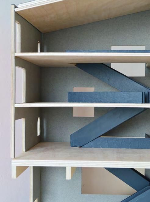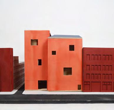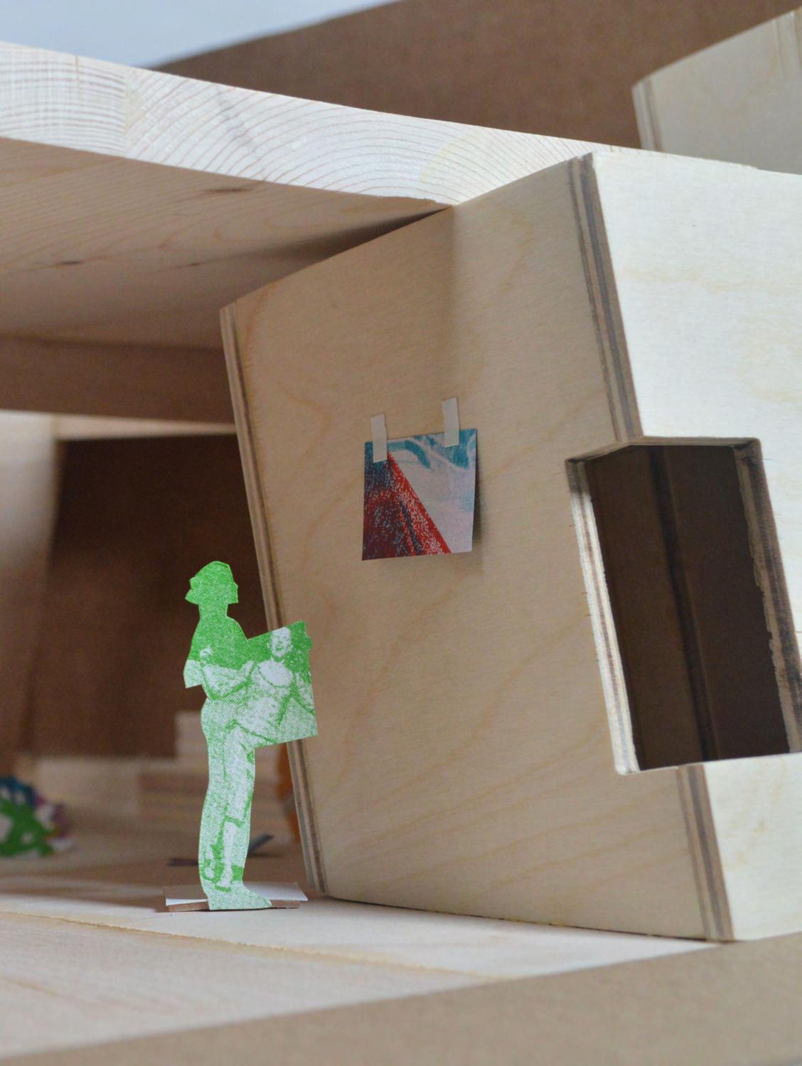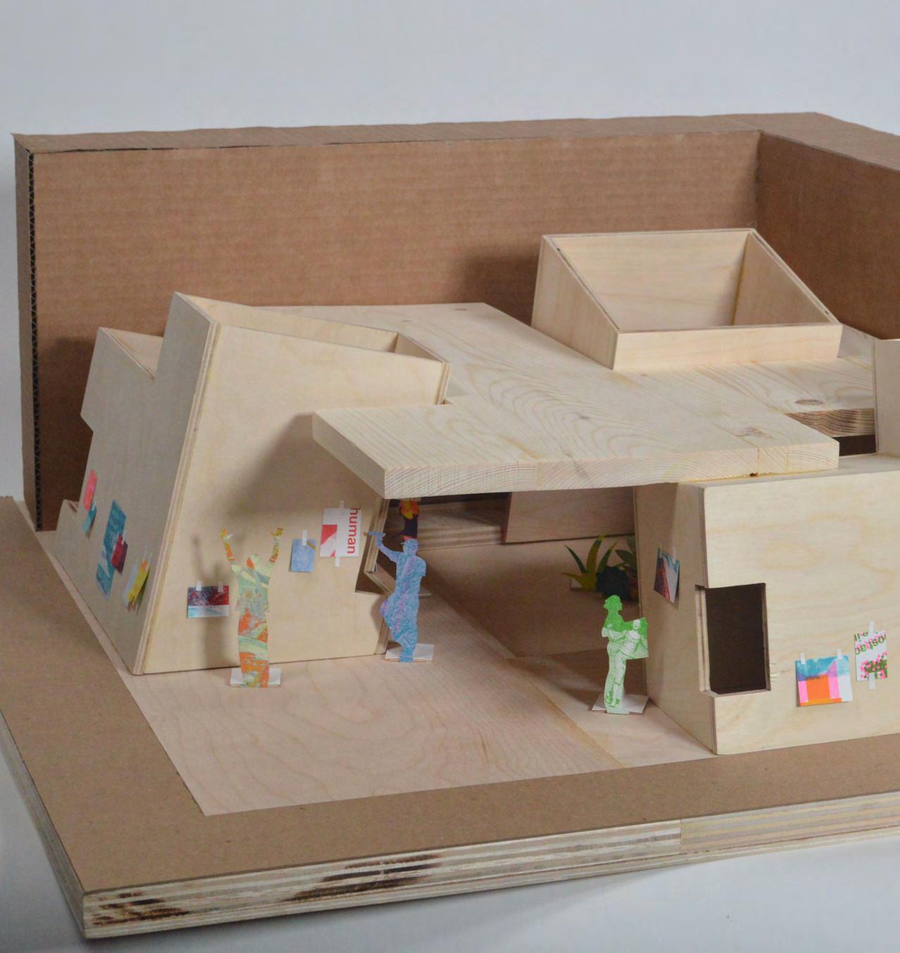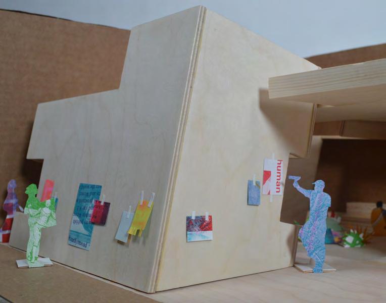 Wood joinery serves as loose inspiration for this public kiosk. Wide cut-aways at the canopy meet canted buildings below with a light touch. Slanted walls, a deviation from the adjacent buildings, welcome passers-by into the light-filled inner courtyard. Riso Depot provides in-house printing, storage, and sale of zines produced by members of the public, filling an important need in any community for information to be shared quickly and colorfully. Scale figure materials courtesy of RISD Riso studio scraps.