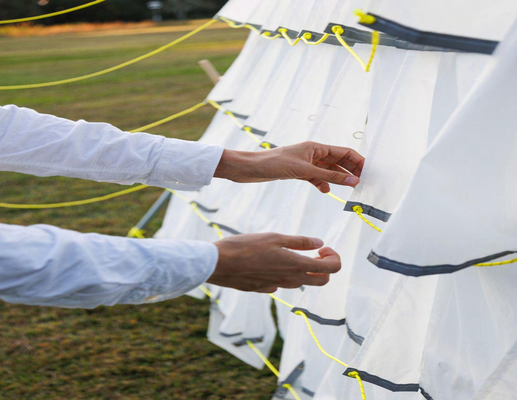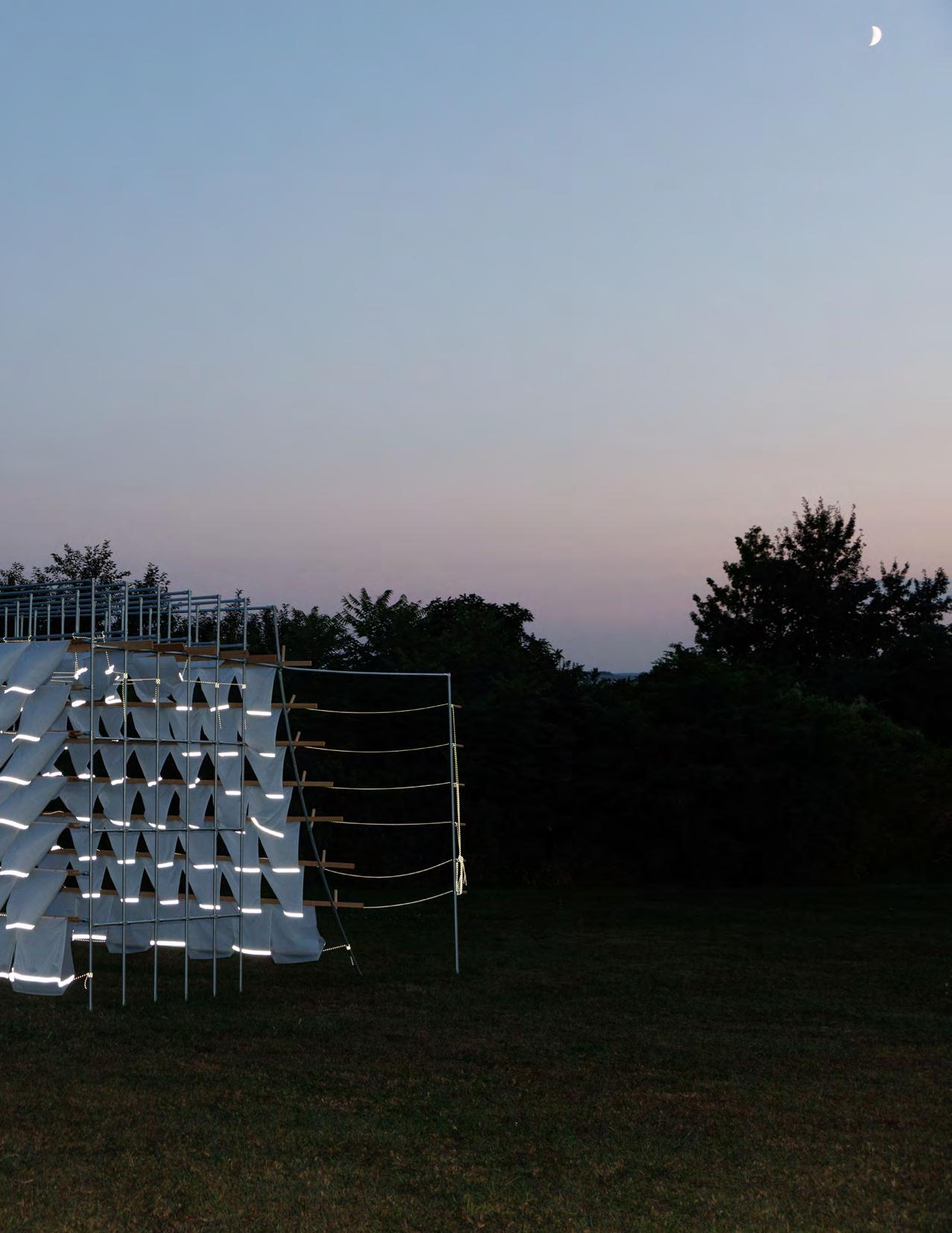 An assembly manual tells an imagined narrative of the pavilion’s construction, tailored to suit the occupants’ needs. The fabric lends a temporality and ritual aspect to the unifying move of weaving the buildings together. Tasked only with a few loose program requirements including an office and restroom, the project’s central aim is to provide flexible public assembly space. Volumes are interspersed with existing outdoor circulation paths connecting a nearby pedestrian bridge to the park beyond.