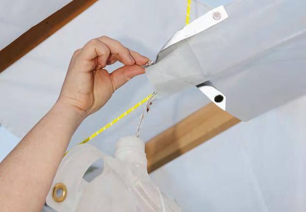 Soft shingles move in response to wind, alternating between concave and convex. The bright paracord can be tied in different patterns to control their movement, such as in preparation for stronger gusts of wind. When it rains, water is caught in pouches on the roof or flows through the shingles and into pouches along the bottom. These interventions require a human operator to interact closely with small, precious quantities of water, standing in contrast with the largely-invisible water infrastructure we are accustomed to.