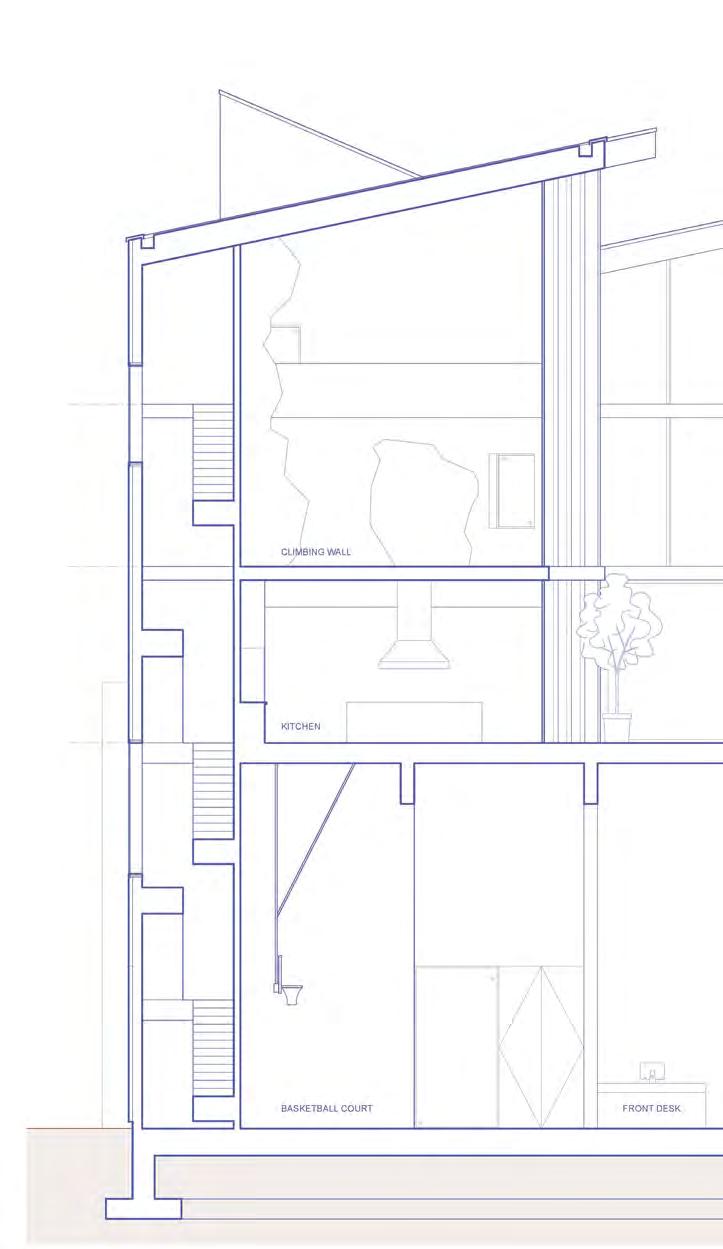 Concealed from the street and ground floor, a central courtyard is revealed at the second floor. Community center visitors and artists in the live-work studios next door can enjoy access to the outdoor seating and assembly space here.