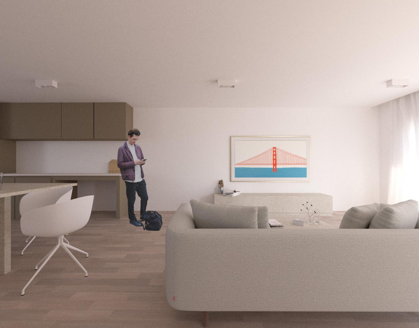In the architectural vision, the buiding is a hub where entertainment and commerce converge, fostering community inclusivity. Here, barriers fade, and all find solace. A café, office, and versatile performance space unite to serve diverse needs. Neutral colors and materials cocoon the interior, cocreating a welcoming haven. The rectilinear form, adorned with elegant hues, celebrates minimalism’s beauty, creating open spaces. In this 100-word manifesto, we pledge to sculpt a space where comfort knows no bounds, offering solace to every inhabitant, and where aesthetics serve the unity of purpose and the elevation of human connection.