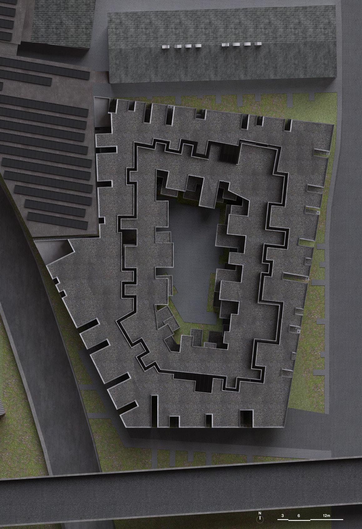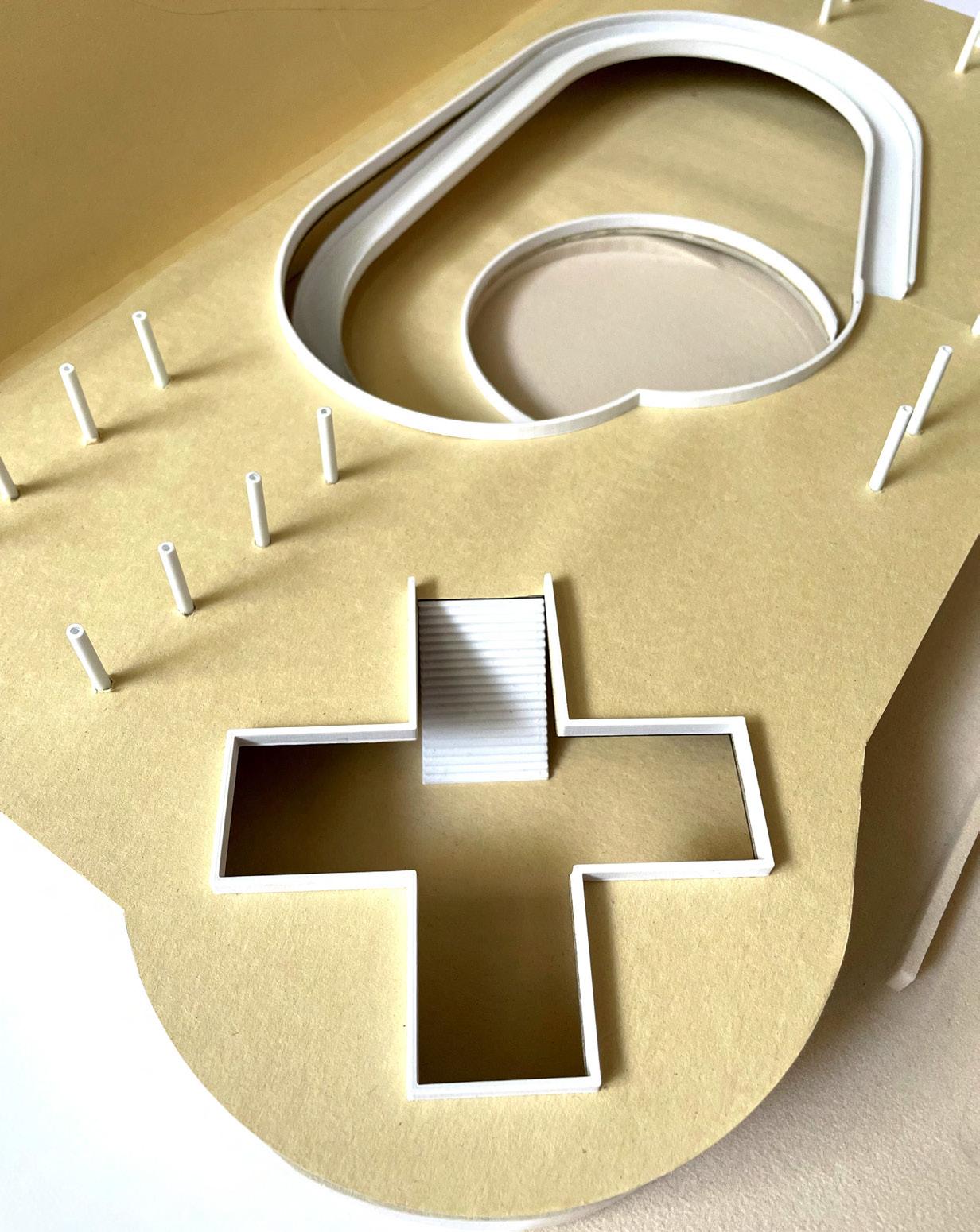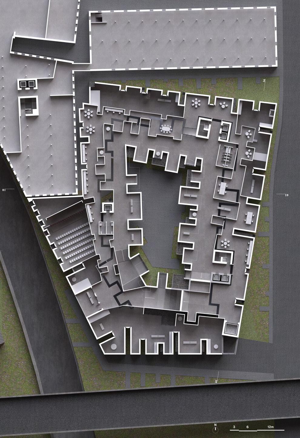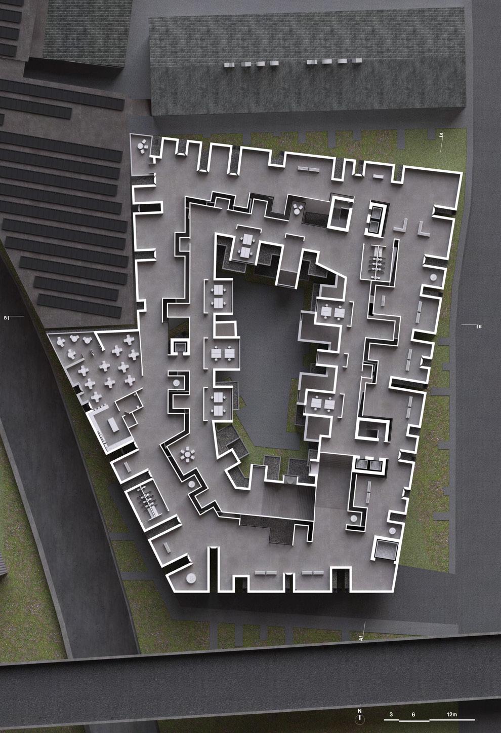 by a paperclip inspired ramp that circles a large courtyard. This building began with a concept diagram that focused on the connections between center and central. The courtyard is folded away from the center to create a new central area that houses the main entrance and circulation core. The courtyard and central core are connected through the loops of the paperclip ramp. The landscape pulls from the theme of municipality as the placement of the walls are taken from the lines on my birth