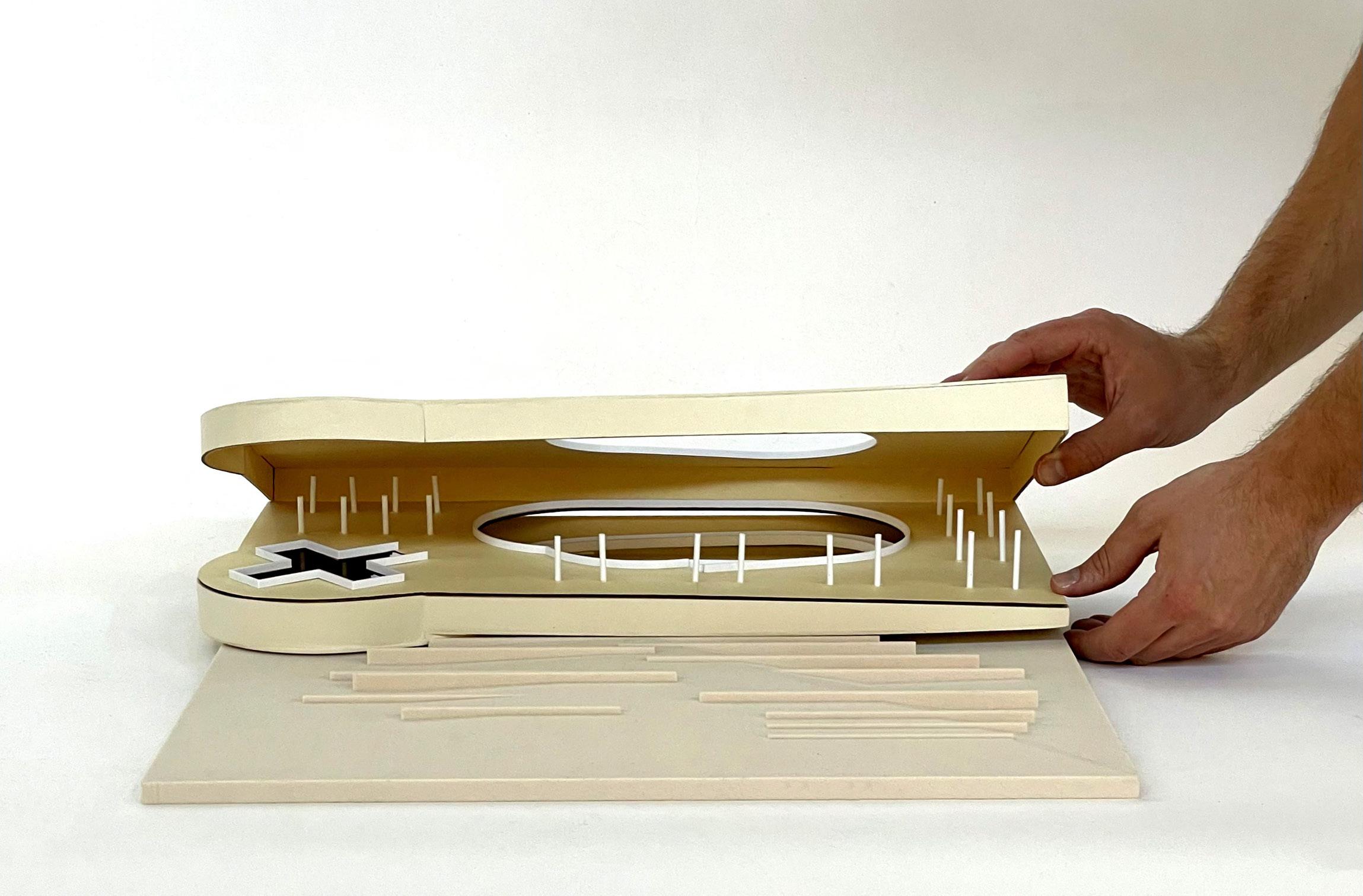 This project combines three civic programs into one building: municipal services, a library, and a childcare center. Pulling from themes of stationery and paperwork, the building mimics a book, slightly hinged open by a ribbon window wrapping around the exterior. The corner of the building peels up
