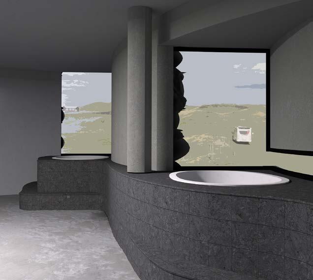 breweries, the brewing equipment is organized vertically and occupies an elongated core accompanied by vertical circulation. The glass enclosed brewery can be observed from both inside and outside of the building, emphasizing the connection between the brewing process and the building program. The towering in the North and South directions towards the Skútustaðagígar Craters and the volcanic range formed by the Mid-Atlantic Ridge. A curtain like façade offers privacy for guests enjoying spa t eatments, while peals in the curtain create targeted views of these unique sights.