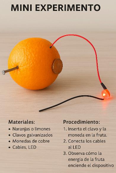 Lasfrutascomolasnaranjasoloslimonescontienen ácidos naturales que pueden generar electricidad. Alinsertardosmetalesdistintos,comounamoneda de cobre y un clavo galvanizado, se produce una reacción química que libera electrones. Ese movimiento de electrones crea una pequeña corriente eléctrica capaz de encender un LED o una calculadora.