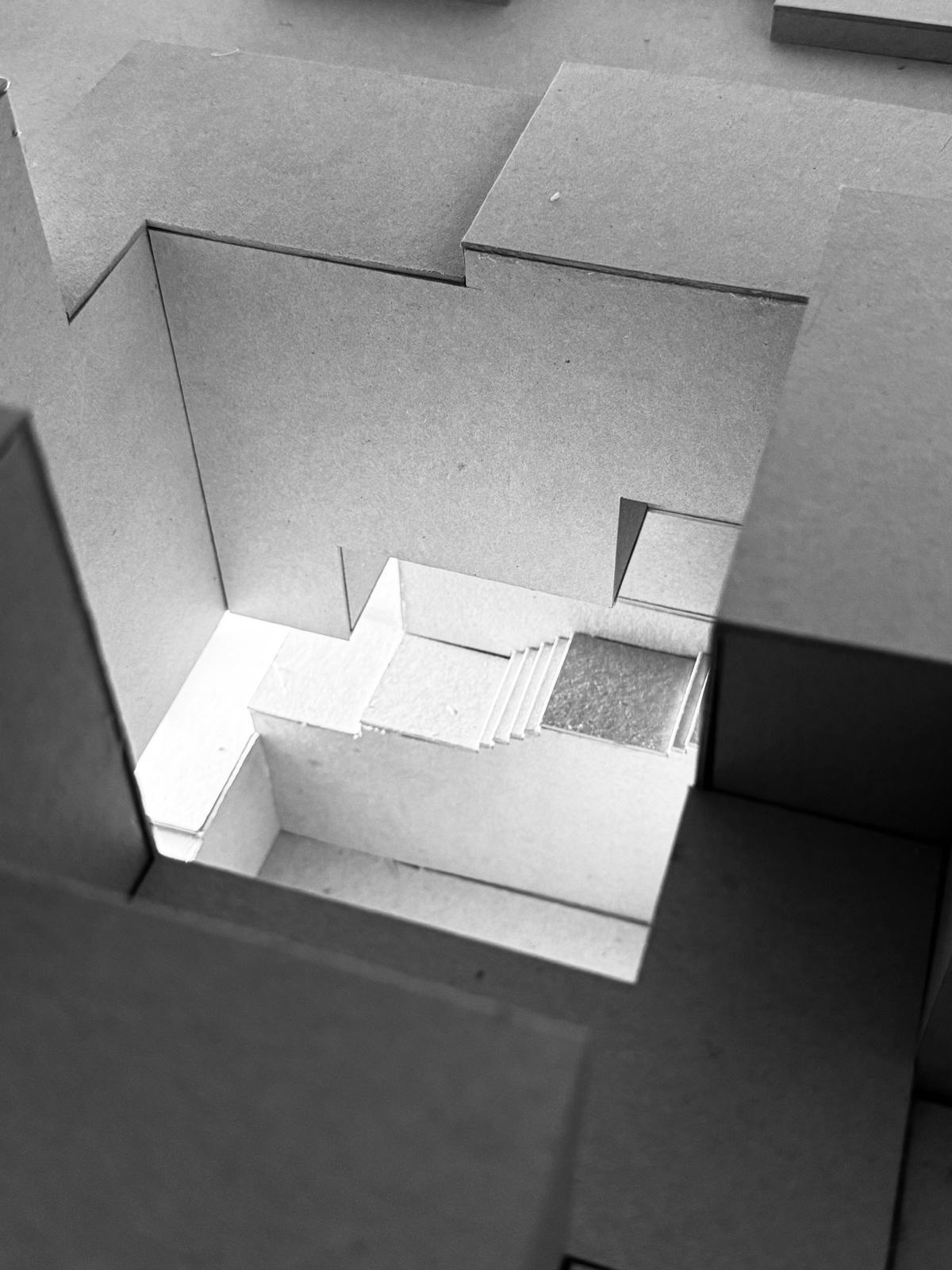 Through carving out and piling up above, a labyrinth like structure is created which develops in to a cavelike volume descending, as an abstract spiral towards a man made riverbed (Wienfluss), with three exhibition plates lit by three monumental shafts. The design is inspired by the Carrara quarries.