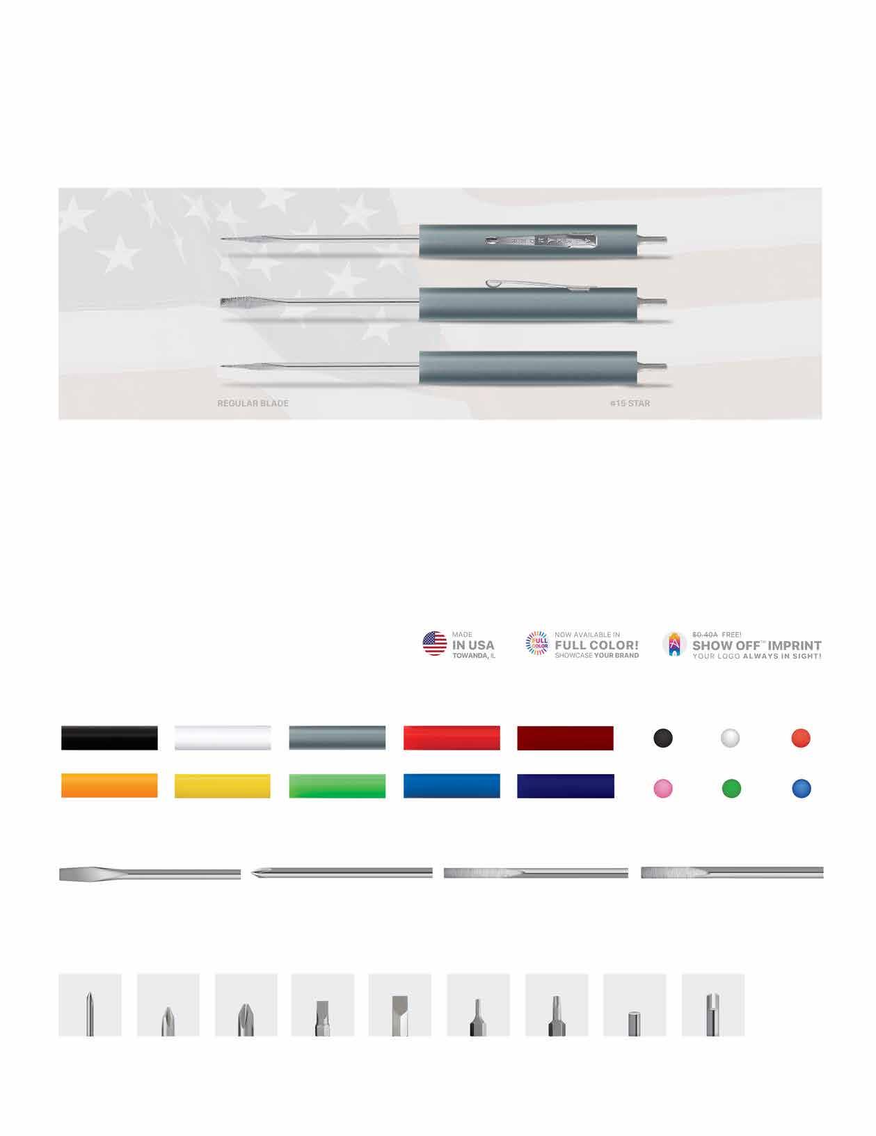 8 CATALOG 2023 | SCREWDRIVERS MIN 200 ORANGE PMS 151 YELLOW PMS 109 GREEN PMS 802 BLUE PMS 661 NAVY PMS 280 BLADES PHILLIPS SIZE 0 HEAD REGULAR BLADE .125” WIDE HEAD ELECTRICIAN .125” WIDE HEAD