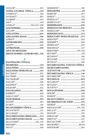 Benadryl®.........................................342 Benazepril..................................69 Benefix®.............................................457 Benlic®................................................131 BenzacAC®.........................................149 Benzetacil®......................................304 BENZNIDAZOL.............................230 Benzoato de bencilo ..............231 Benzolam®........................................736 Benzonatato............................515 Beractant intratraqueal ...515 BeriateP®...........................................452 BERININ® P..........................................456 Beriplast®.........................................437 Berodual®.........................................527 Berosynt®.................................519, 702 Betadip®.............................................130 Betaduo®...........................................160 Betagen®............................................131 Betaloc®............................................100 Betametasona, fosfato sódico de/Betametasona, acetato de................................159 Betametasona tópica............130 Betarretin®......................................152 BETAXOLOL ................................603 Betazkov®.........................................161 Betazol®............................................135 Betoptic®...........................................603 bevacizumab............................646 Bexon®................................................249 Bianos®...............................................320 bicalutamida...........................647 BICARBONATO DE SODIO............476 Bienex®...............................................826 BiEuglucon®.............................176, 191 Biflace®..............................................505 Biguax®...............................................191 Binoclar® .........................................248 Binotal® ............................................225 Biocalcium®......................................367 Biocronil®.....................................84, 85 Biofigran®.........................................665