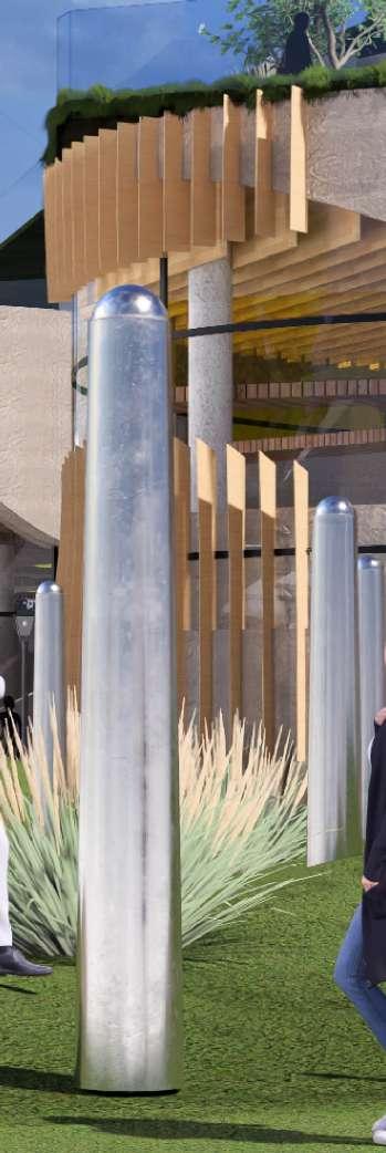21. Mycelium Panels, with external waterproof coating, glued to the mesh with natural resin. The vapour control barrier and insulation layers have been added to ensure no interference of the mycelium with the steel, just as a precaution for steel’s longevity. As the mesh is flexible and lightweight, it will not be an impediment in the structural capabilities of the primary steel structure; moreover, it improves the columns stability. Both the mycelium panels (grown in custom molds) and the mesh are maleable in terms of shape, so the column will apear as organically formed mycelium structures to the outside eye.