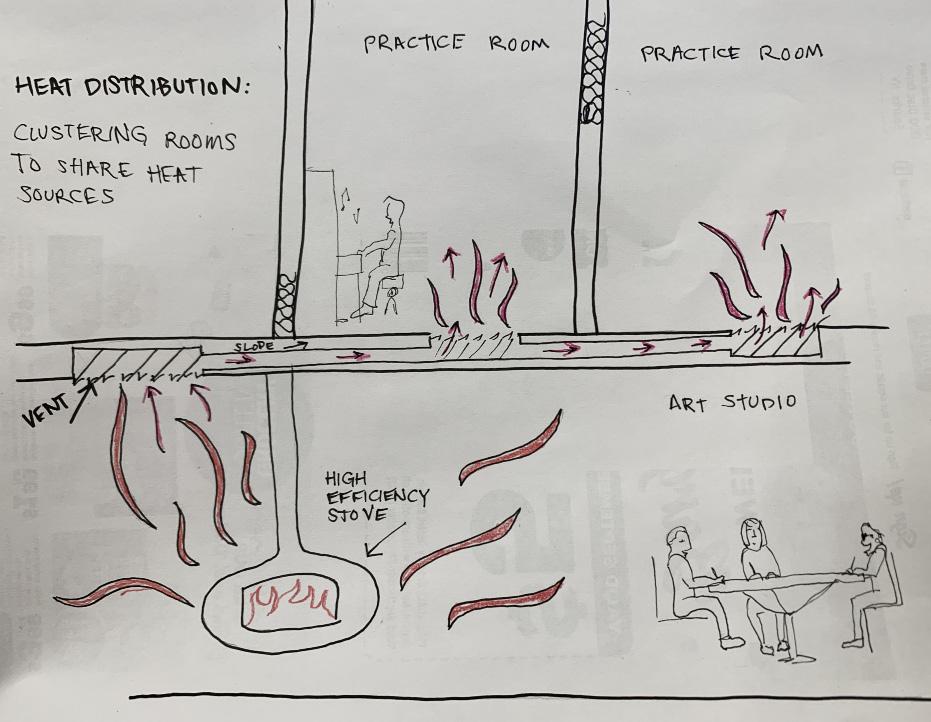 clustering classrooms in vented shared spaces allows heat to be recycled in winter.