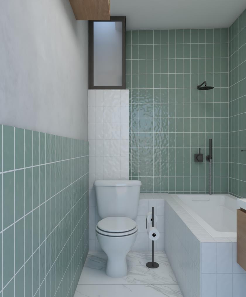 Proyecto de remodelación en donde se diseñó el baño y la lavandería de un pequeño departamento en el distrito de Pueblo Libre. Se tuvo como prioridad la implementación de los tonos verde menta y grises con pequeños toques de madera para transmitir un espacio de relajación.