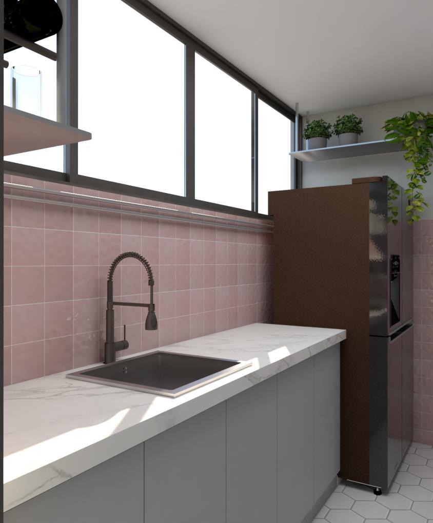 Proyecto de remodelación en donde se diseñó la cocina de un pequeño departamento en el distrito de Pueblo Libre. El diseño estuvo de acorde al color principal y favorito del cliente: el rosado. La paleta de color escogida fue con tonos grises para que así genere un contraste adecuado.