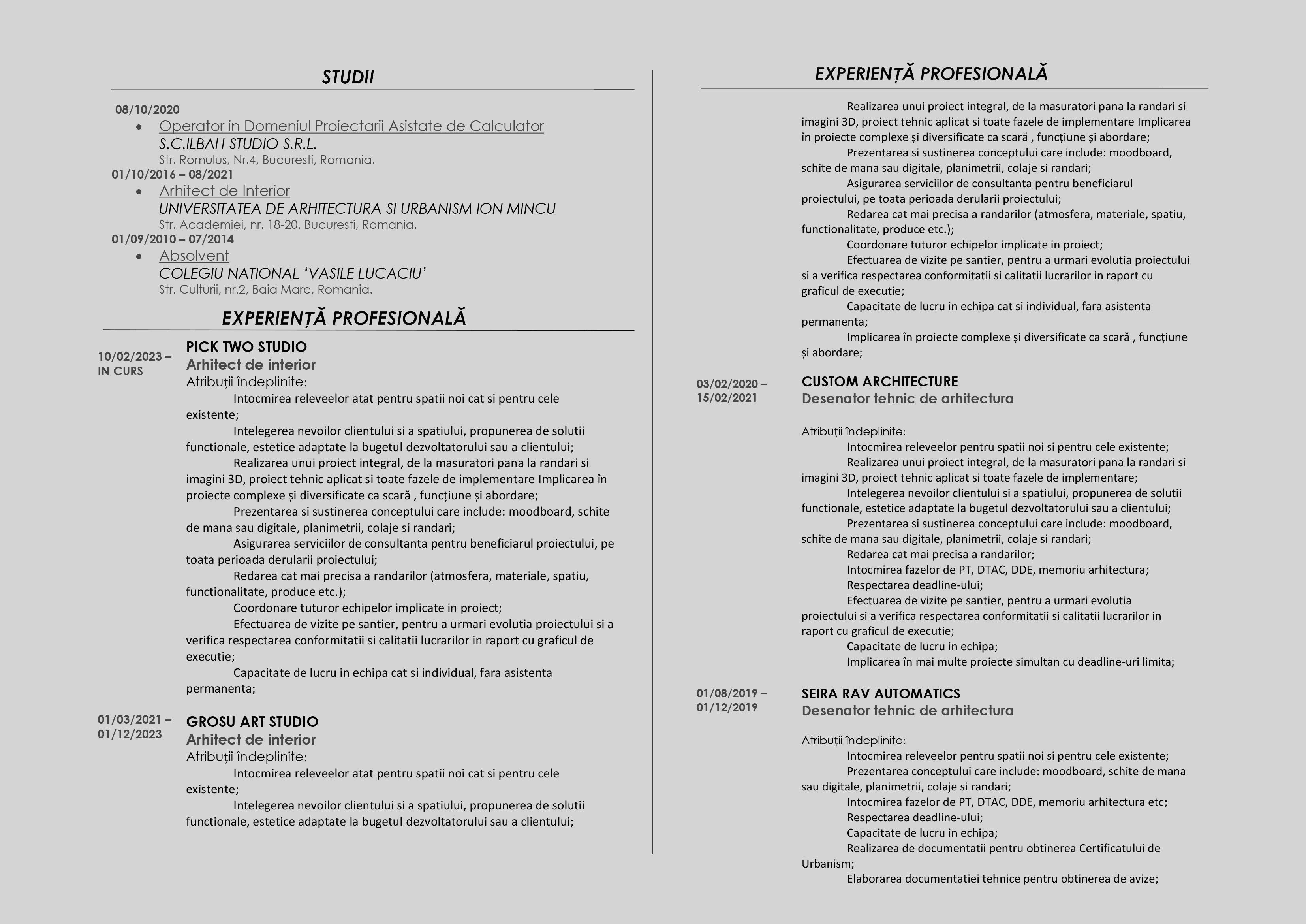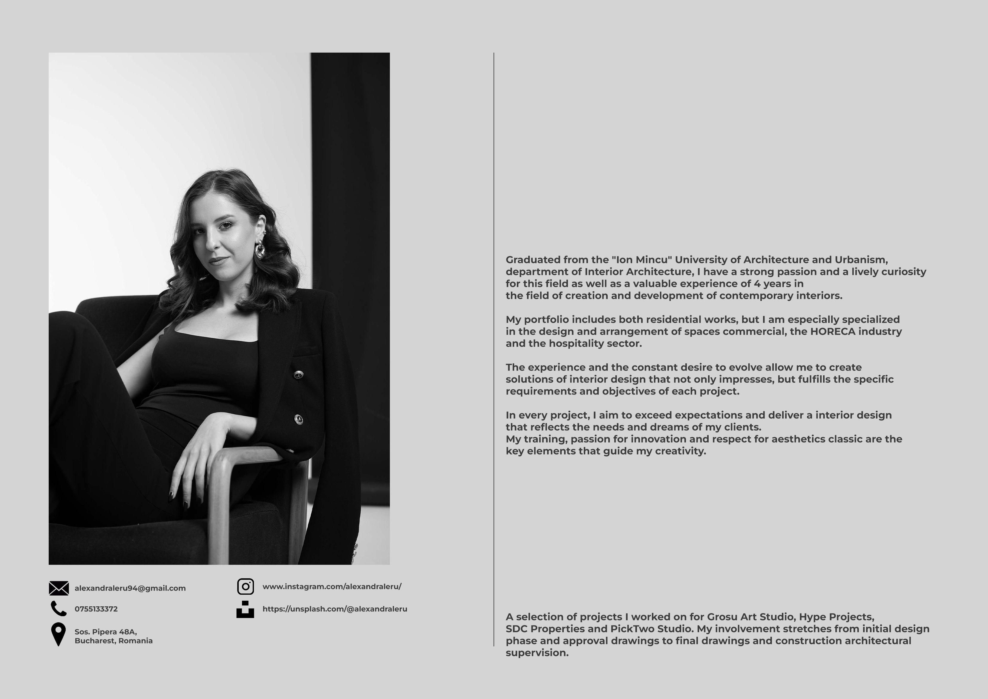 Absolventă a Universității de Arhitectură și Urbanism „Ion Mincu", secția Arhitectură de Interior, am o pasiune puternică si o curiozitate vie pentru acest domeniu, precum și o experiență valoroasă de 4 ani în domeniul creației și dezvoltării interioarelor contemporane. Portofoliul meu cuprinde atat lucrări ce țin de domeniul rezidențial, însă sunt în special specializată pe proiectarea și amenajarea spațiilor comerciale, industria HORECA și pe sectorul ospitalității. Experiența și dorința constantă de a evolua îmi permit să creez soluții de design interior care nu doar să impresioneze, ci să și îndeplinească cerințele și obiectivele specifice fiecărui proiect. În fiecare proiect, îmi propun să depășesc așteptările și să ofer un design interior care să reflecte nevoile și visurile clienților mei. Pregătirea mea, pasiunea pentru inovație și respectul pentru estetica clasică sunt elementele cheie care îmi ghidează creativitatea. Împreună, putem transforma spațiile într-o poveste autentică și captivantă.