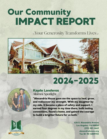 Individuals are living safely in our affordable housing Kenmore Building of our alumni continue to receive ongoing support 59 240 Women graduated from our SUSLA Entrepreneurship Program in 2024 39 72 300, of our families transition to permanent housing 90%