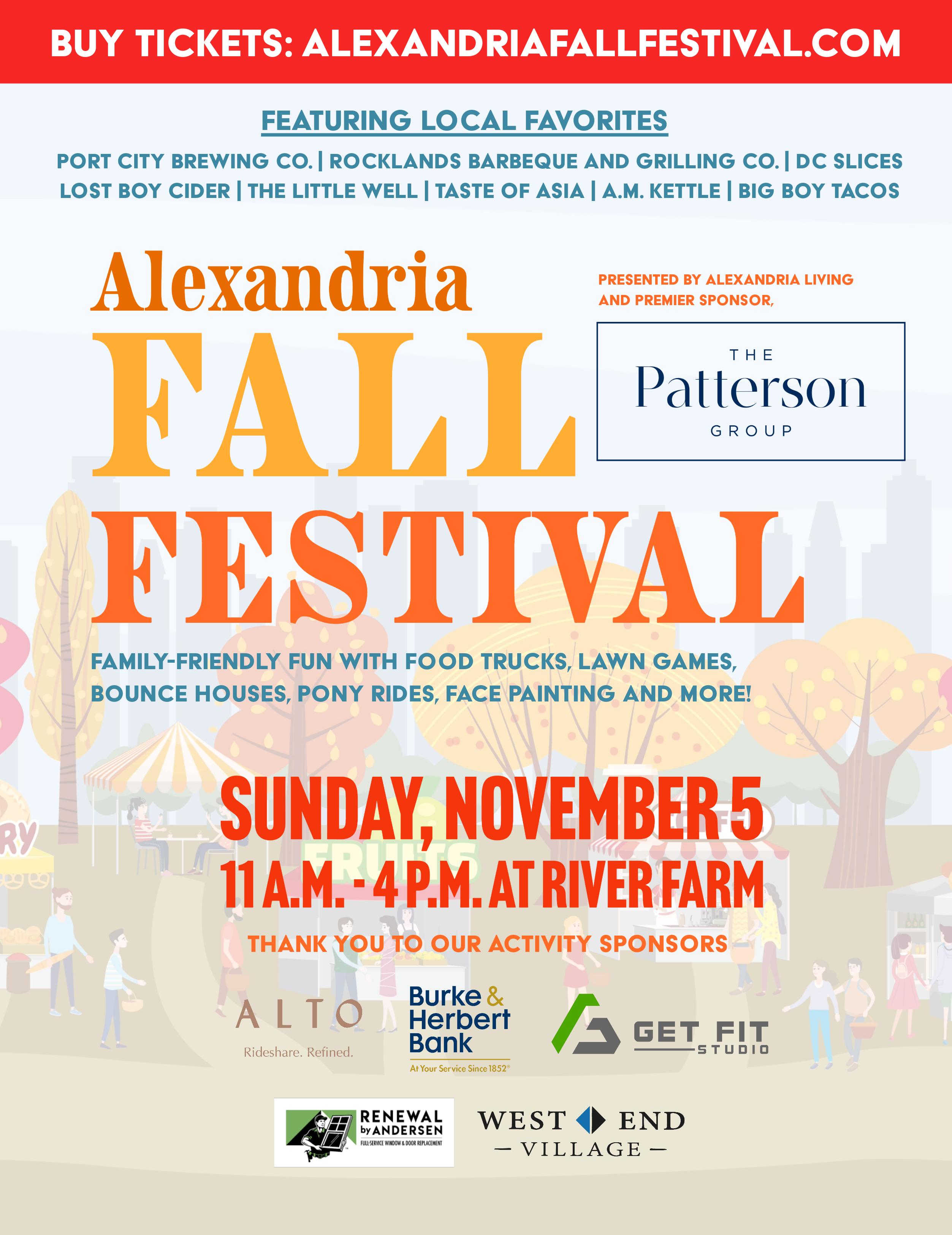 Living's Second Annual Fall Festival Sunday, Nov. 5 at River Farm, presented by our premier sponsor, The Patterson Group. Our event sponsors include Alto, Burke & Herbert Bank, Get Fit Studio, Renewal by Andersen and West End Village.