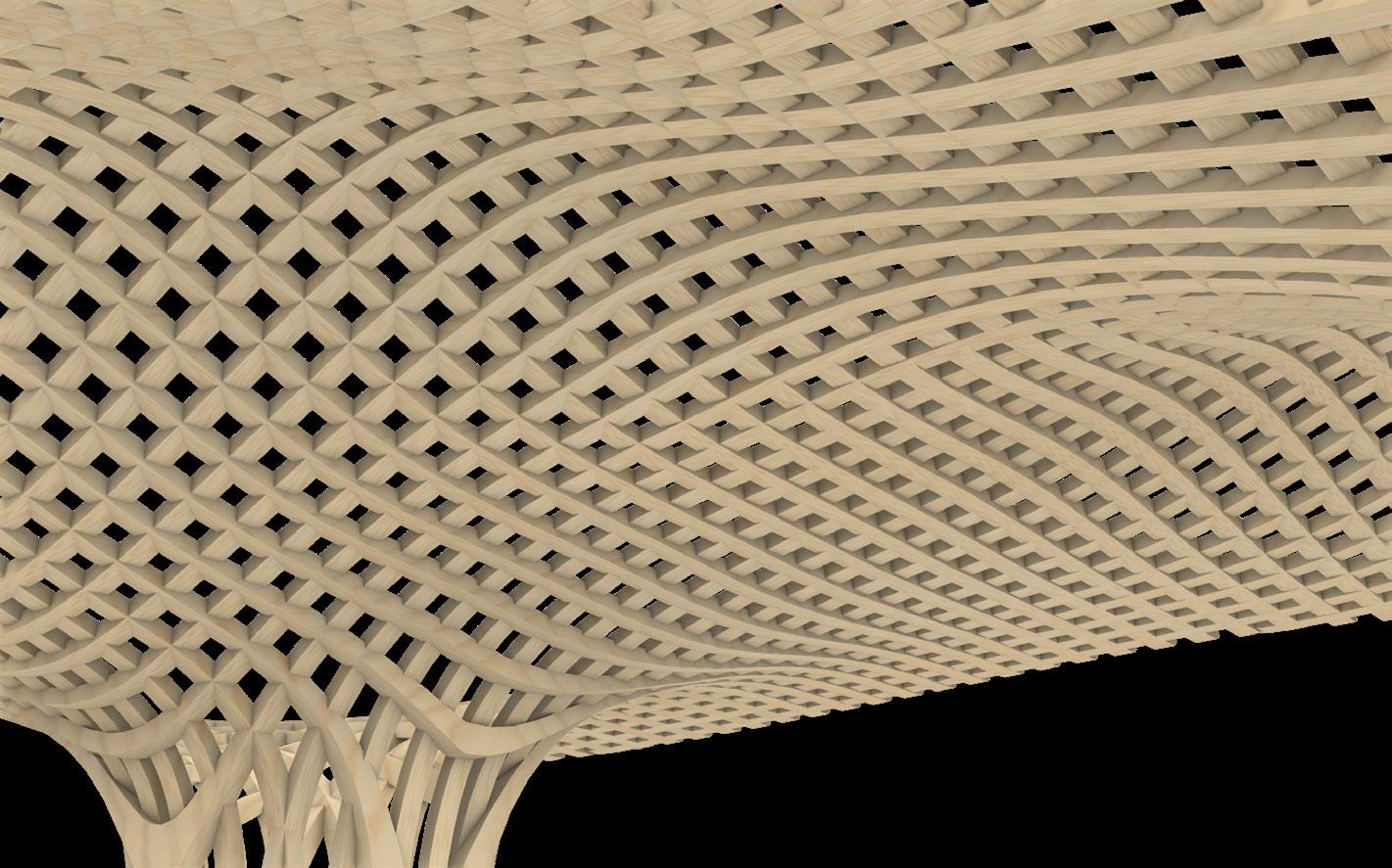 Material articulation of a woven timber canopy for phase 4, that fosters spatial intimacy, filtered daylight, and thermal regulation, reflecting the intersection of tourism (user experience) and transport (climatic resilience) principles