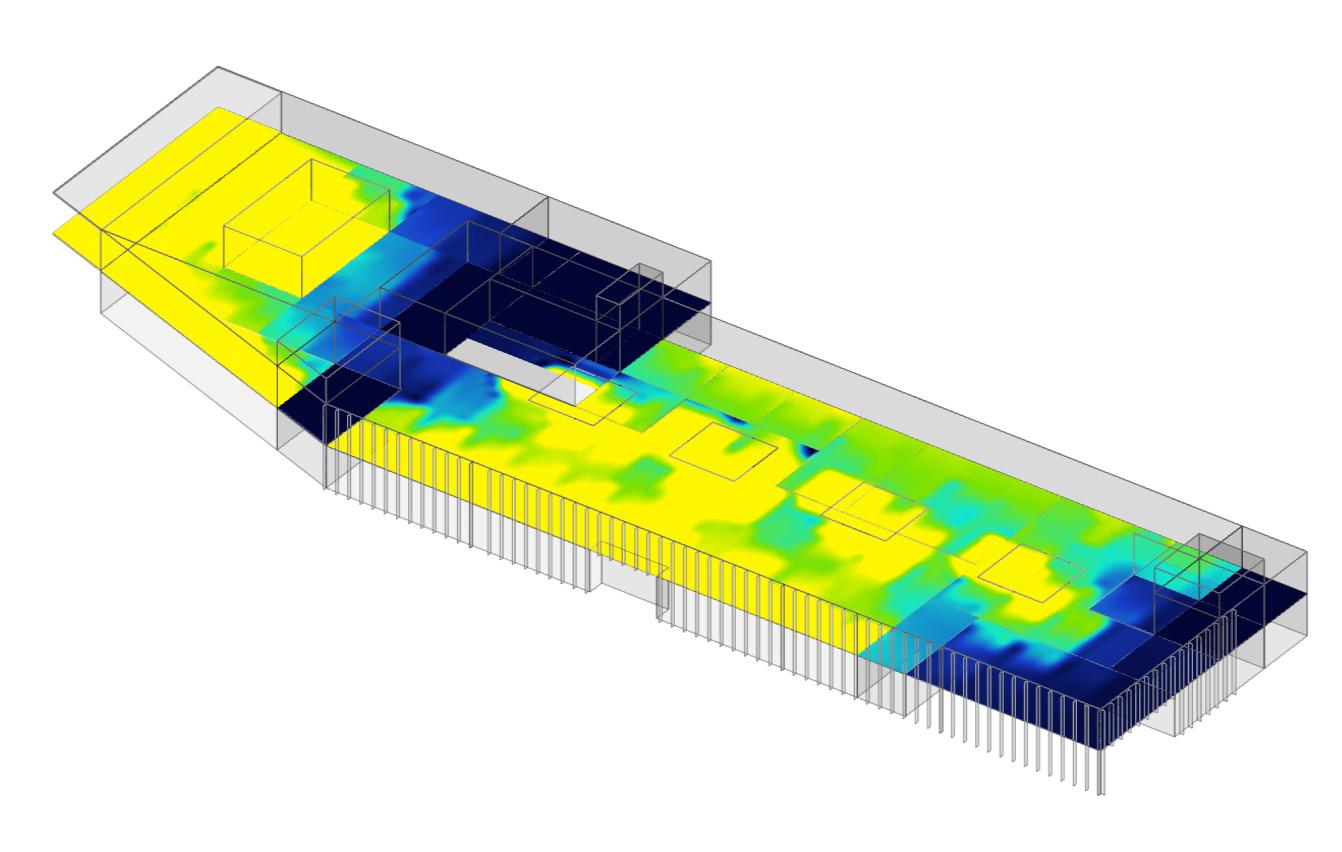 This simulation shows that the ground floor experiences limited daylight penetration, particularly in the central core. Strategic placement of public amenities and circulation areas in low-exposure zones supports energy efficiency by reducing unnecessary artificial lighting demand.