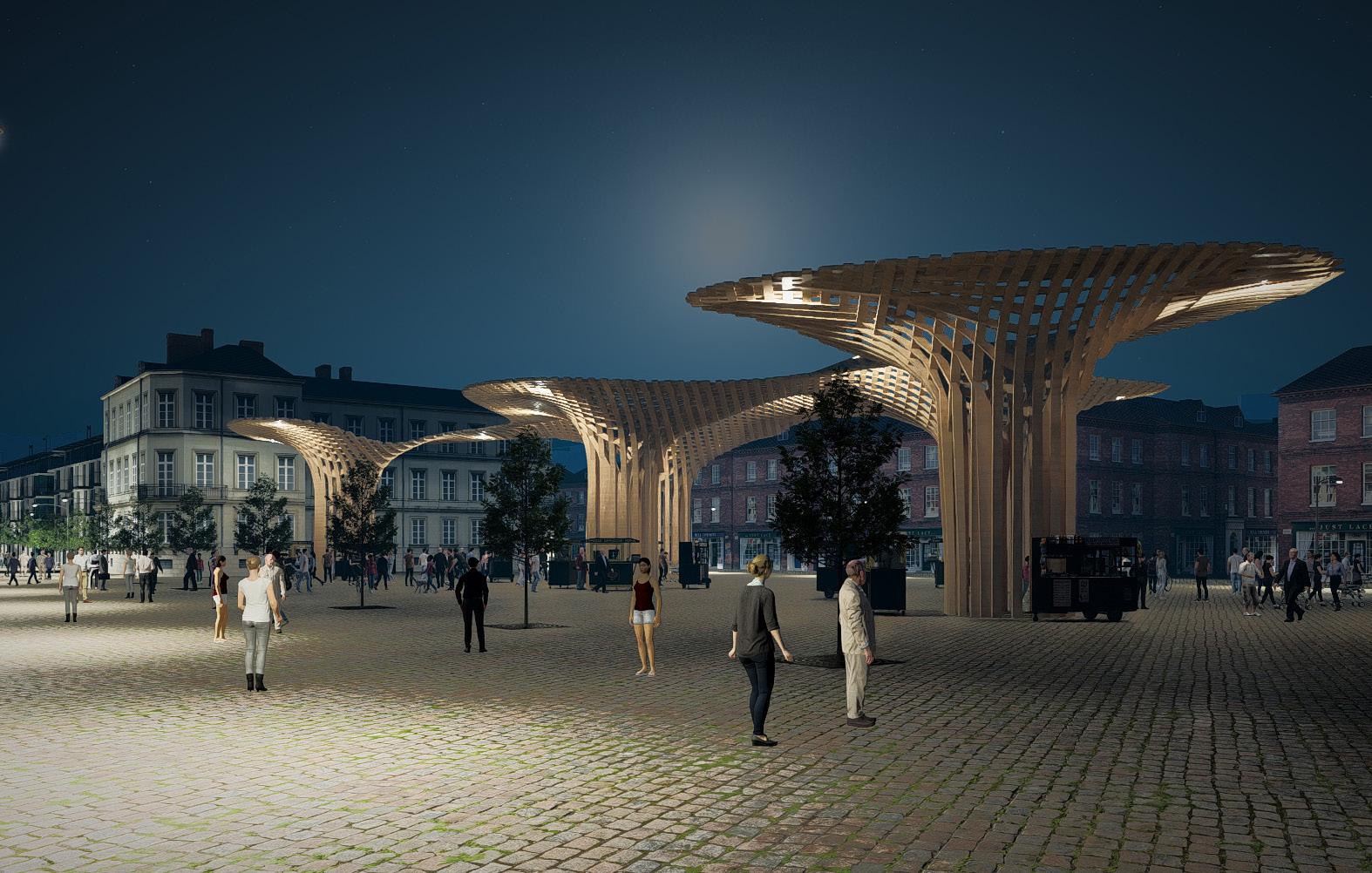 Conceptual visualization of the pavilion in context: demonstrating how sculptural form and structural rhythm create a porous canopy that activates public space and fosters community engagement