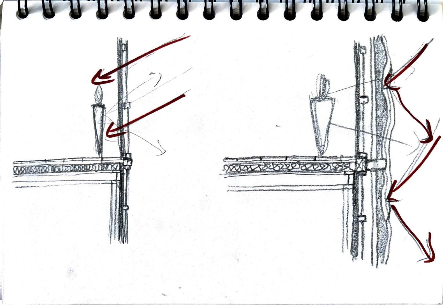 Sectional sketches investigating sun control strategies, focusing on the placement and depth of shading elements. These drawings explore how facade articulation can balance natural daylight access with protection from excessive solar gain, informing both environmental performance and spatial character