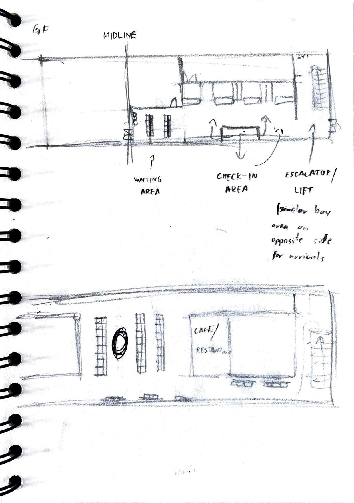 Without access to the upper-level departure zone, a series of speculative sketches were produced to deduce the internal configuration of publicfacing spaces such as check-in, waiting, and commercial areas. The spatial logic inferred from external observation suggests a clear linear arrangement aimed at efficiency, security control, and visual legibility.
