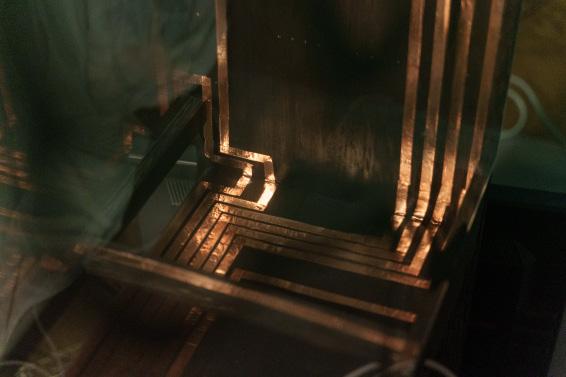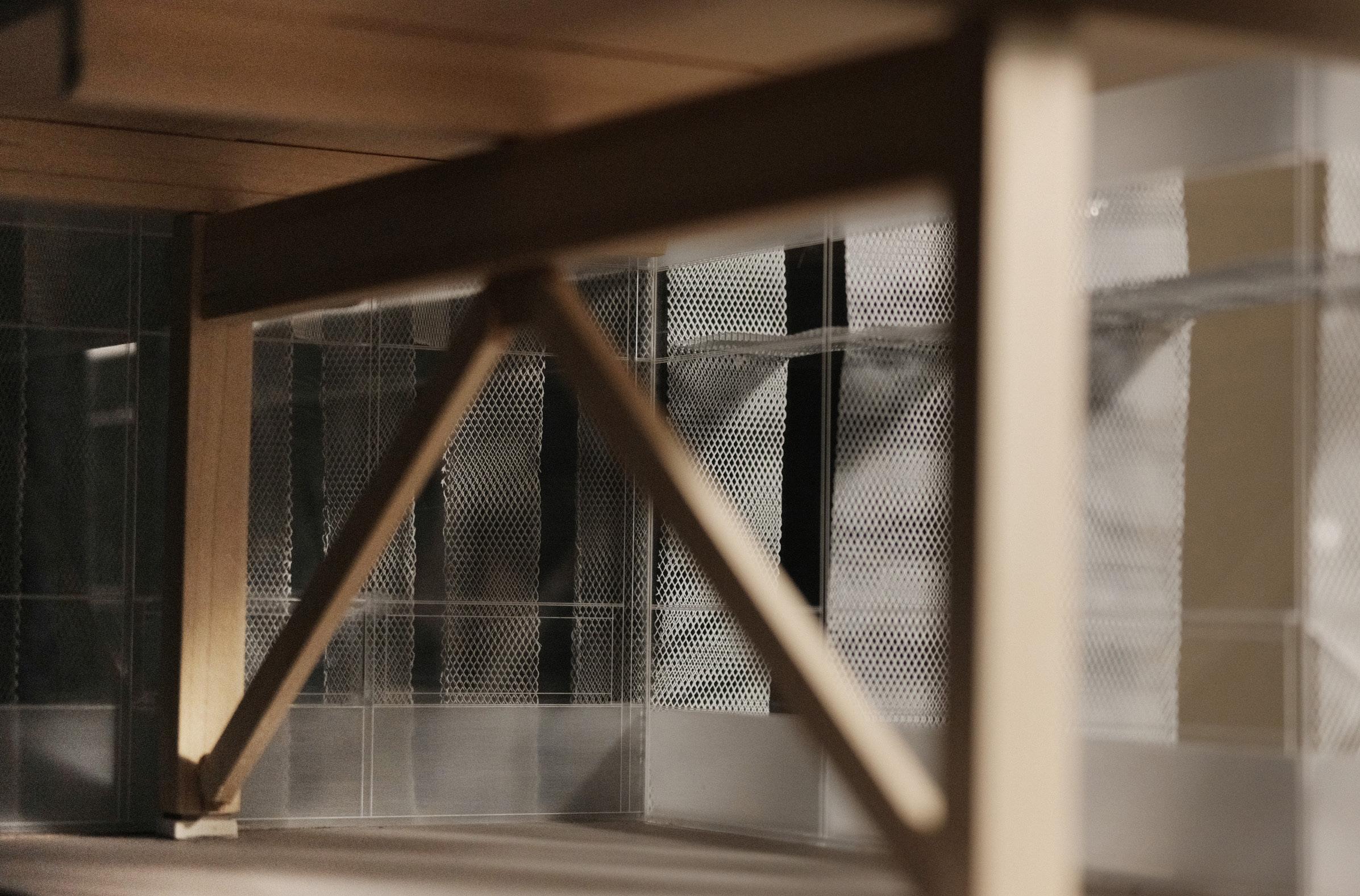 Sitting area above the falling water. Cooling from the water and shadow. Sound from the water. Light effects from perforated metal and slats.