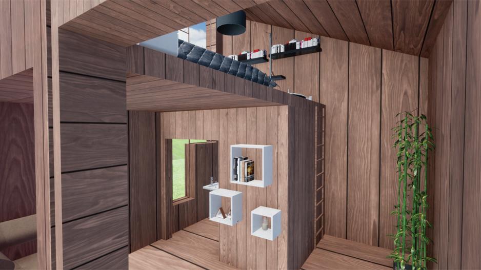 Located in the Finger lakes of New York, this project was a collaboration with two other students to design a mini-home that was under 400 square feet. Packed within that constraint, we were able to place a small garden, master bedroom, loft bedroom, bathroom, lounge, small kitchen, and a large patio.