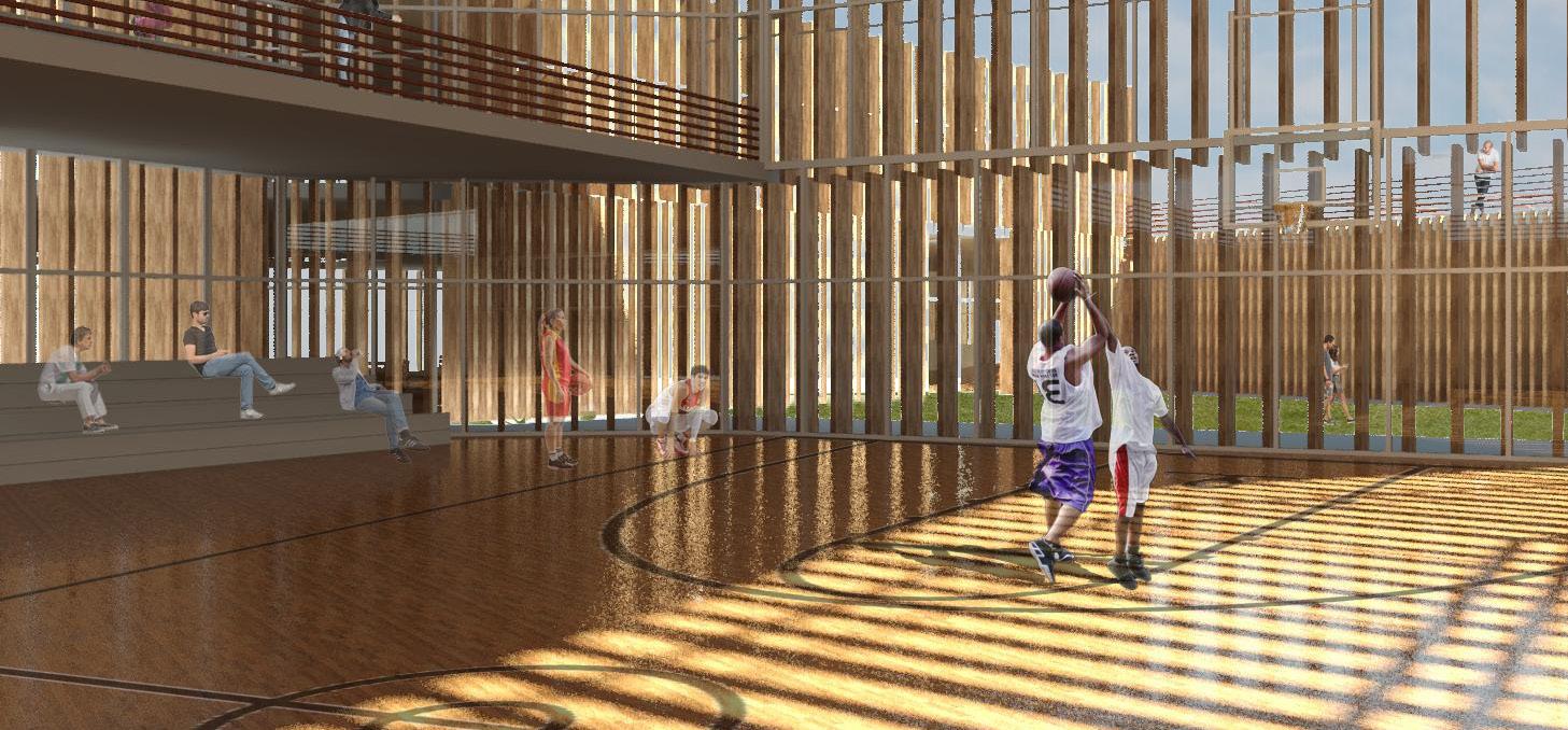 This community center, embedded between multi-story residences provides a safe and accessible space for residents to participate in classes to learn trade skills, languages and arts, stay active with a sport, and reconnect with nature in the extensive outdoor areas.