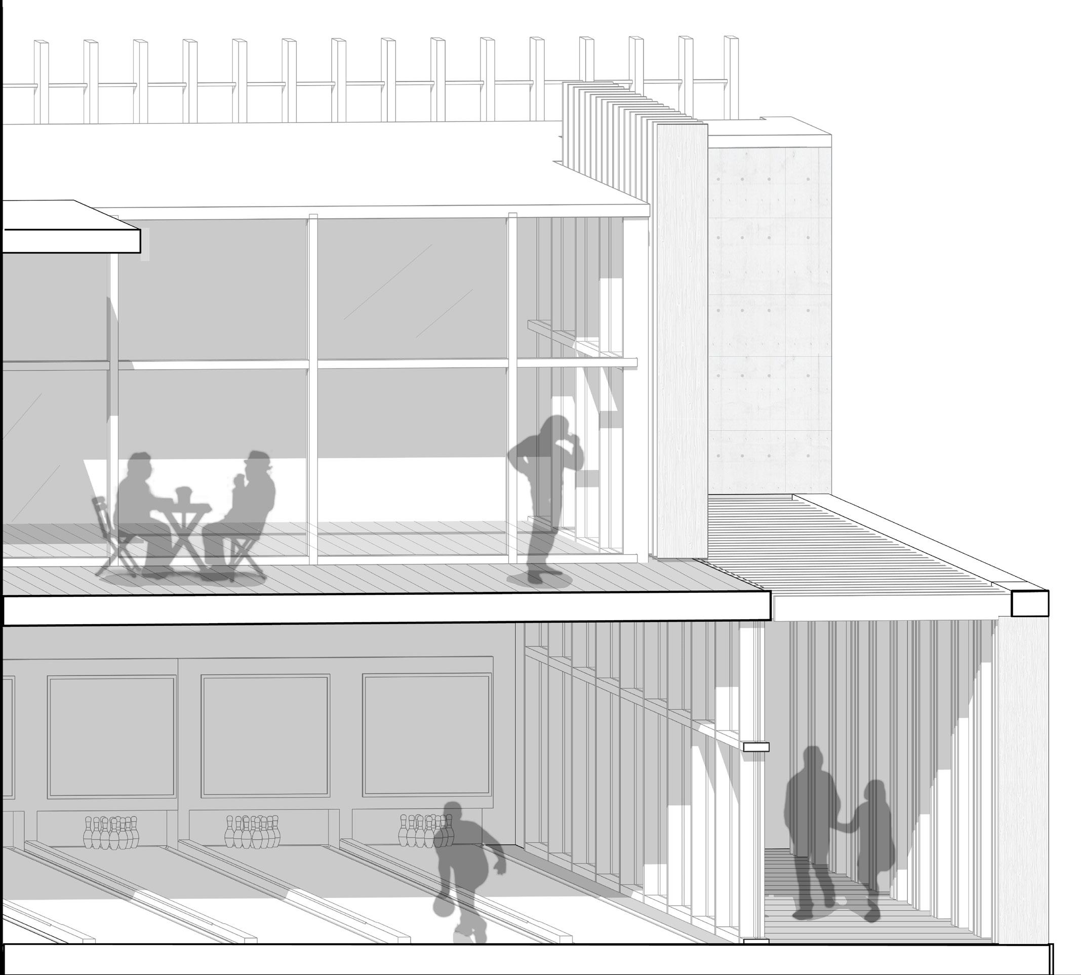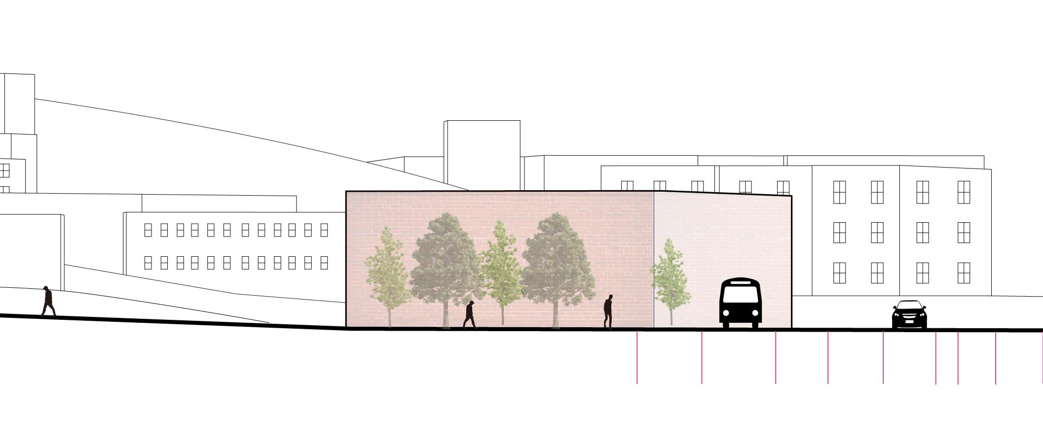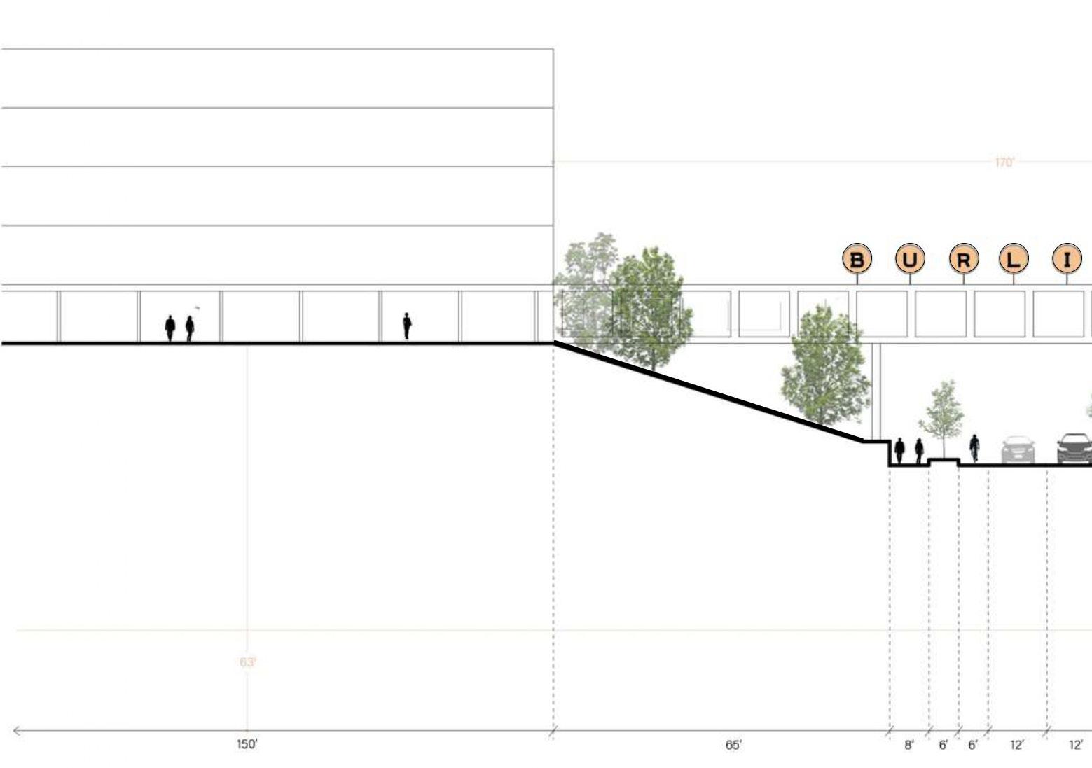 Vine Brook is part of “The District” portion of the site. Through a site section analysis, a vast stretch of largely inaccessible green space is revealed. The urban design proposal for Vine Brook places a well-lit wooden ramp starting at the parking lot and leading up to a nature trail that encourages both rest and activity. On the other side of the trail, parking has been reduced to create bike lanes and landscaped medians between opposing traffic.