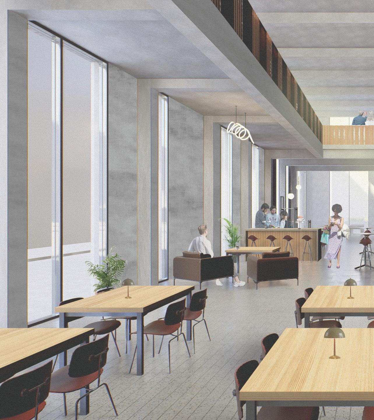 The reading room and exit sequence, as seen from the social terrace