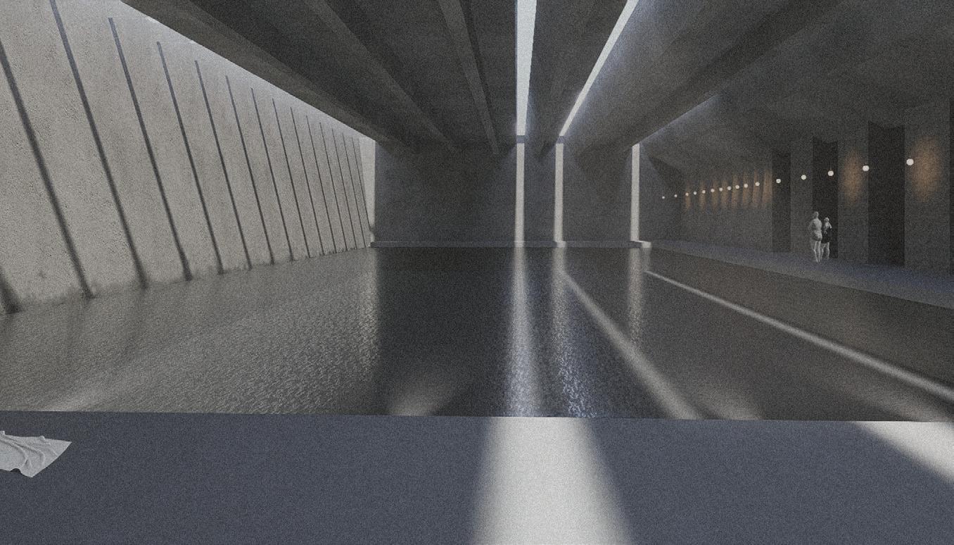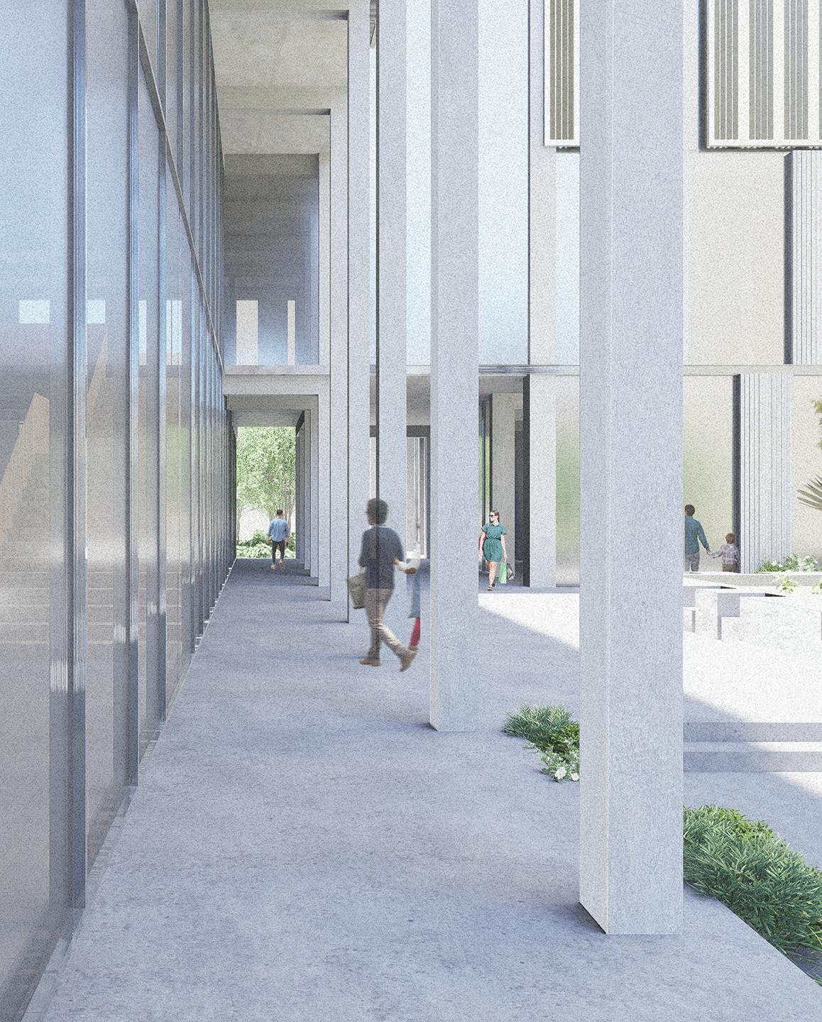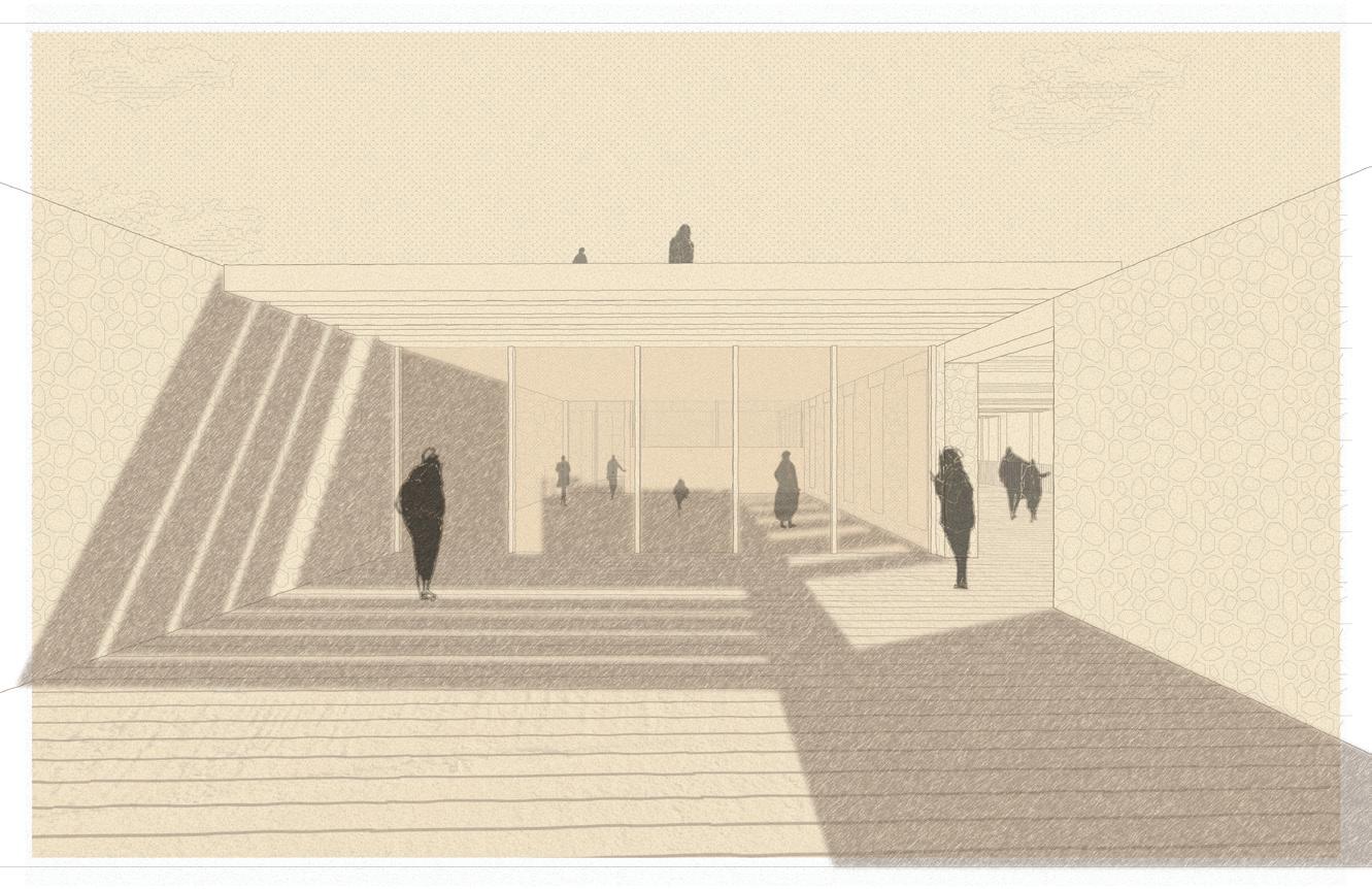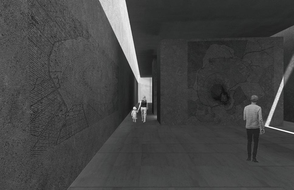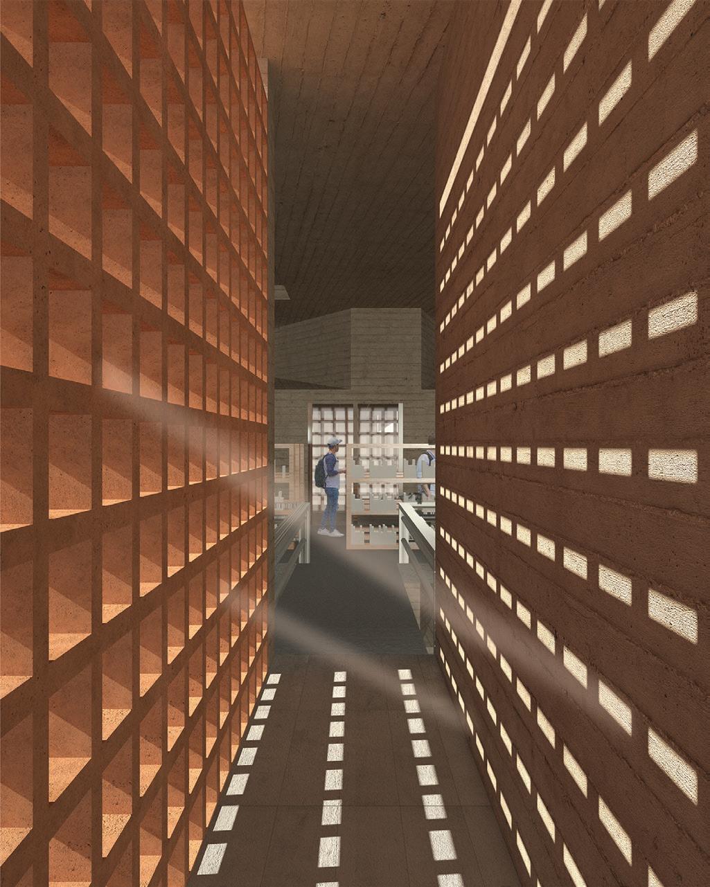 These fingers become the main driver in lighting conditions, experience and programming within the catalyst as they present themselves as massive rammed-earth walls. These walls operate in three different ways: they frame the site and light, they create occupiable space, circulation bands, programming, and experience. Finally, they connect programs and experiences along themselves. Visitors will walk through these walls before breaking through them into large open spaces for reading, exhibition, or performance.
