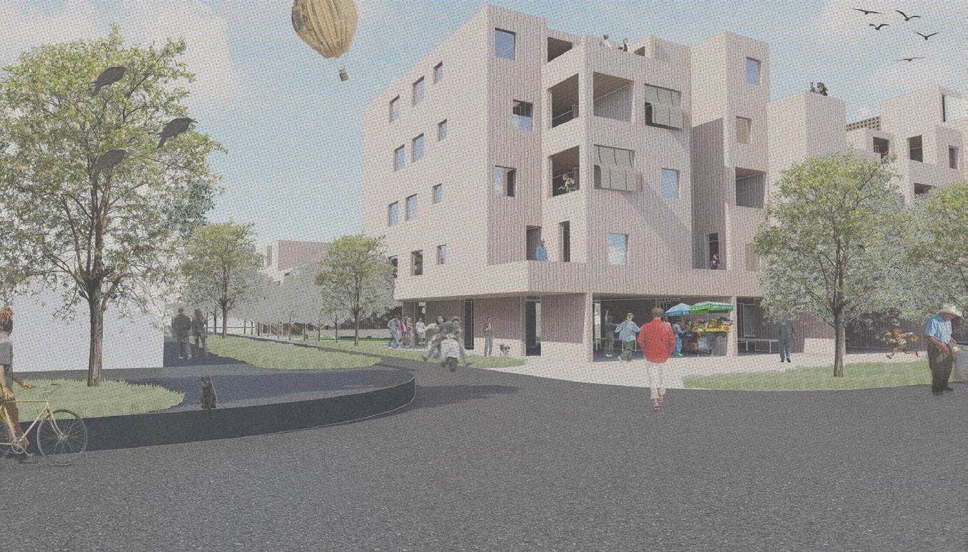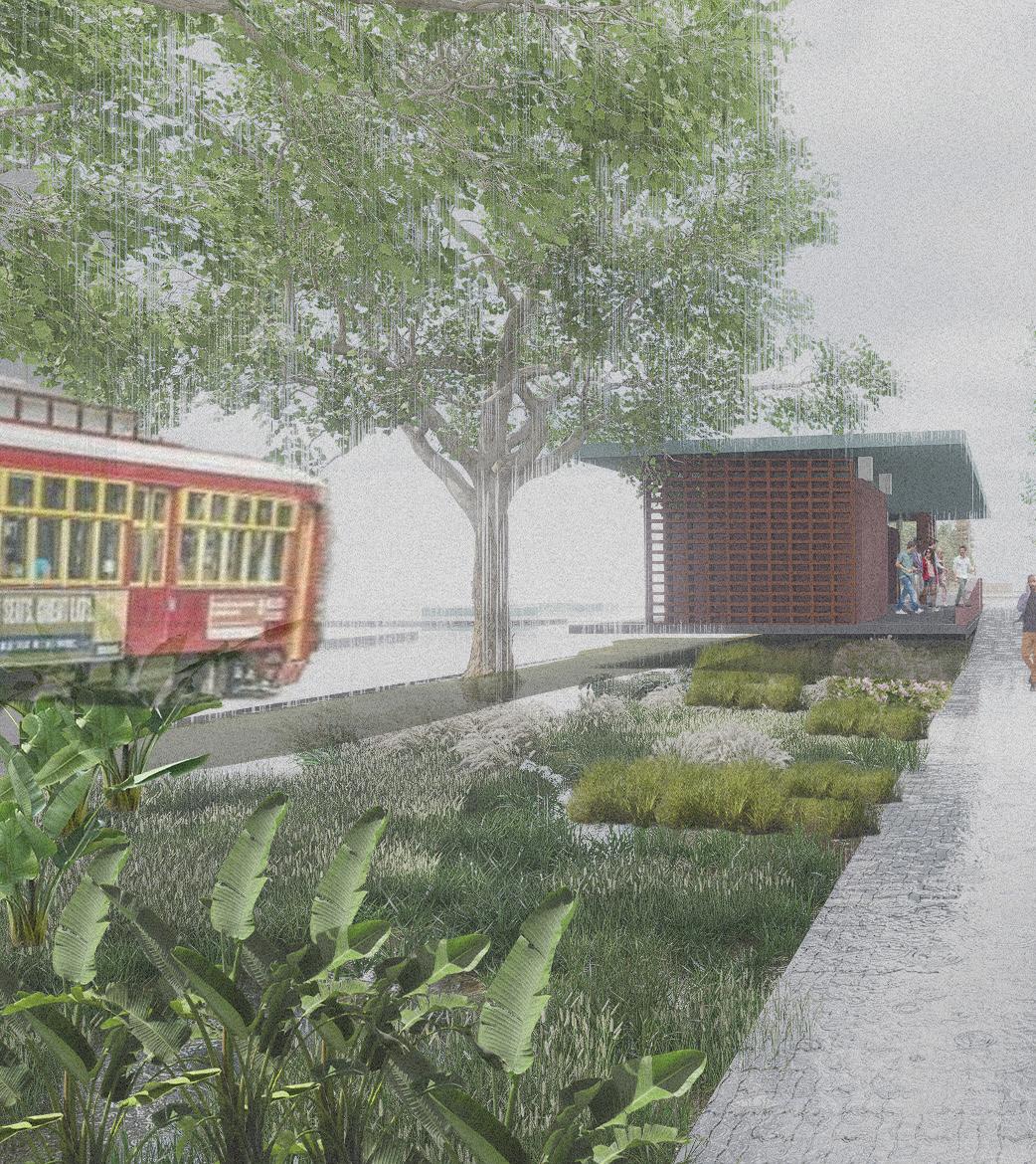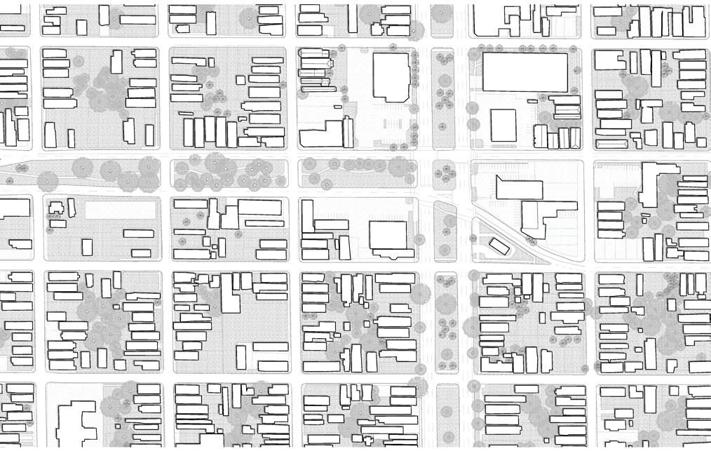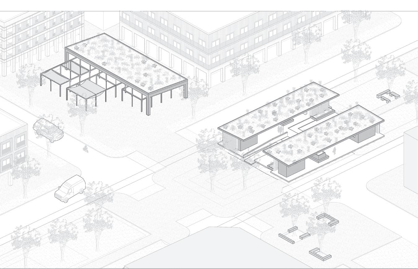 In recognizing the dire lack of grocery services in the area, one corner of the intersection was converted into an ‘urban room’ rather than an enclosed development. Acting as an extension of the typological Neutral Ground, this ‘room’ manifests itself as a flexible covered market, allowing the community to organize weekly markets and other events to foster a strong community connection. Increased density and activity near the street, along with a redesigned street that prioritizes the pedestrian help to make the area more accessible to cross, while allowing the Neutral Ground to once again take its role as a community space, serving as a linear park with intermittent plazas and gathering spaces.