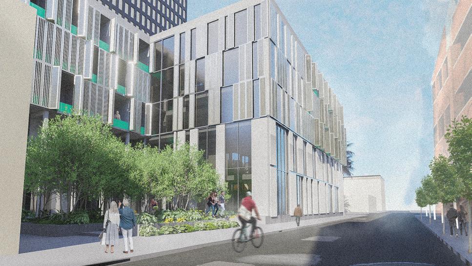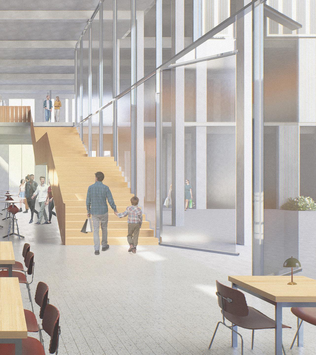 The permeable ground floor, which focuses on the community, houses the vibrant market, a local restaurant, and spaces for the neighborhood to gather and learn.