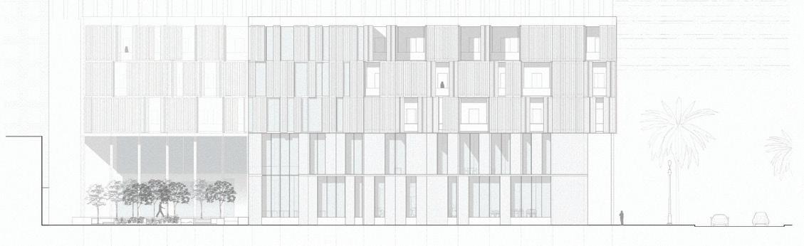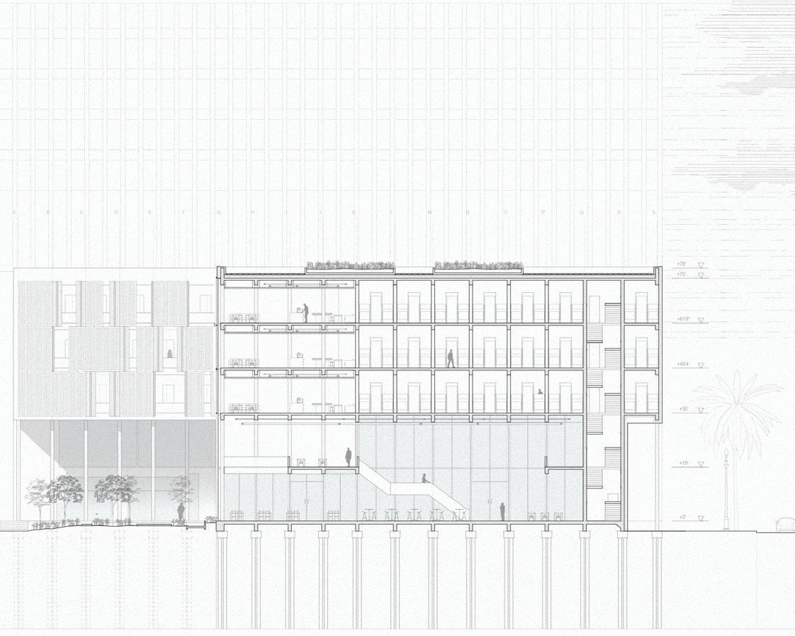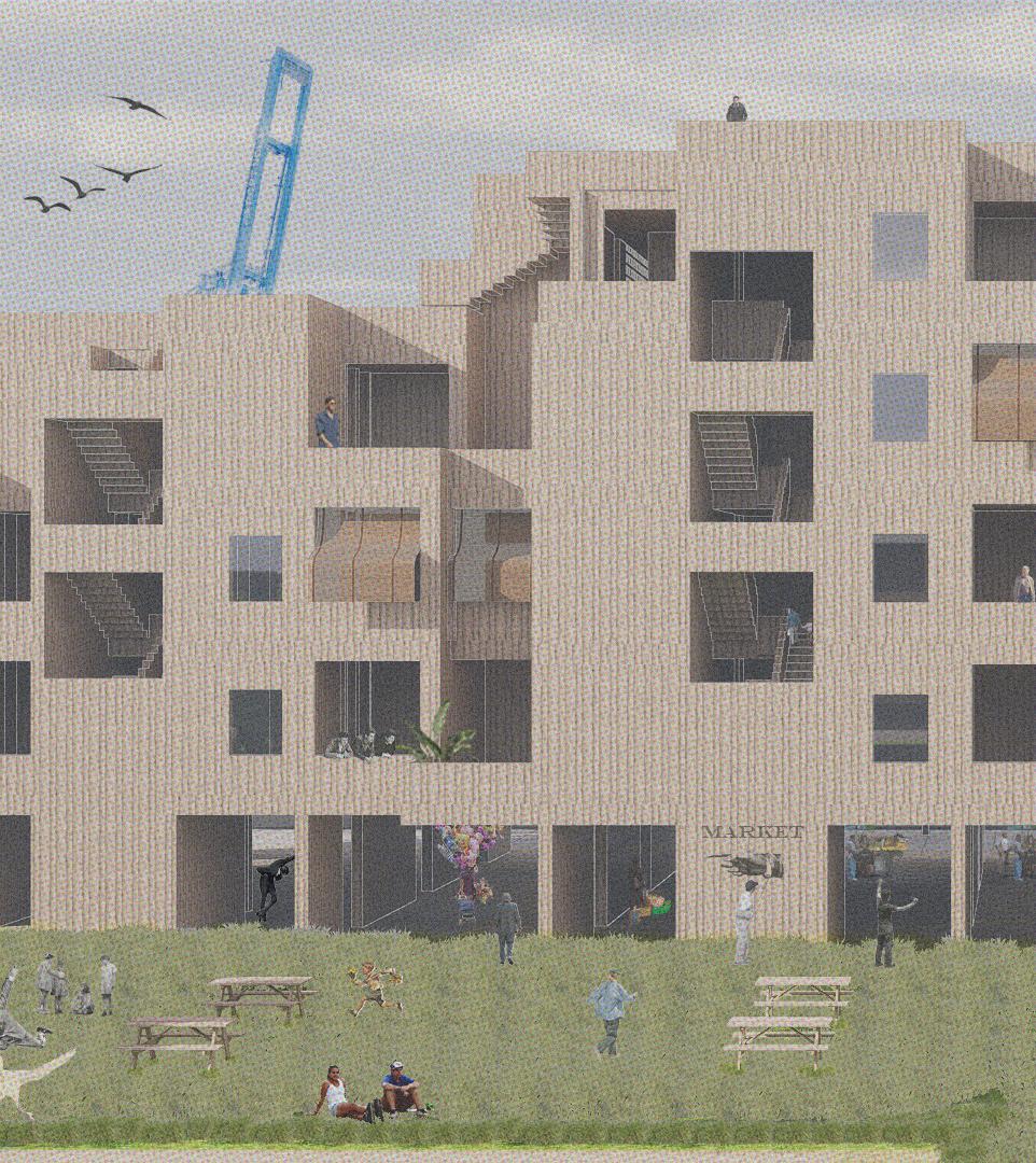 This housing block is a space that fosters community growth, through an open, permeable ground floor with community rooms, a local restaurant, and a covered market facing the new commercial corridor of Tchoupitoulas St. The patio culture of the South is extended to these apartments, with patios punching holes into the facades of the buildings, even in the stairs. This openness allows residents to interact with eachother, and with the community on the ground, creating a sustainably minded community geared towards contributing to the changing scope of New Orleans.