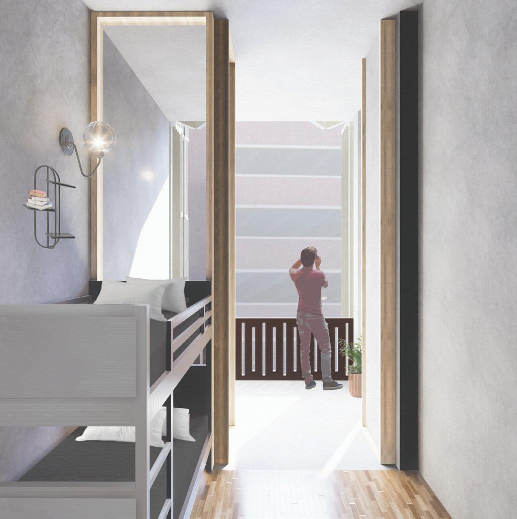 To respond to the duality of the site, two plazas are placed on opposite corners of the site, creating an entry experience for each urban condition. The character of the plazas juxtaposes the character of the surroundings to create a new space within the site. The void left between the plazas becomes the building. From within the building, the one-way concrete structure acts as a frame extending out onto the plazas, creating a porch zone to blend the outside community with the micro-community. From the hostel rooms, a communal living area acts as a porch, transitioning between the public space and the private room. To accentuate this, the facade becomes operable with bifold shutters, allowing each guest to assign a role, whether it be public or private, to their porch space.