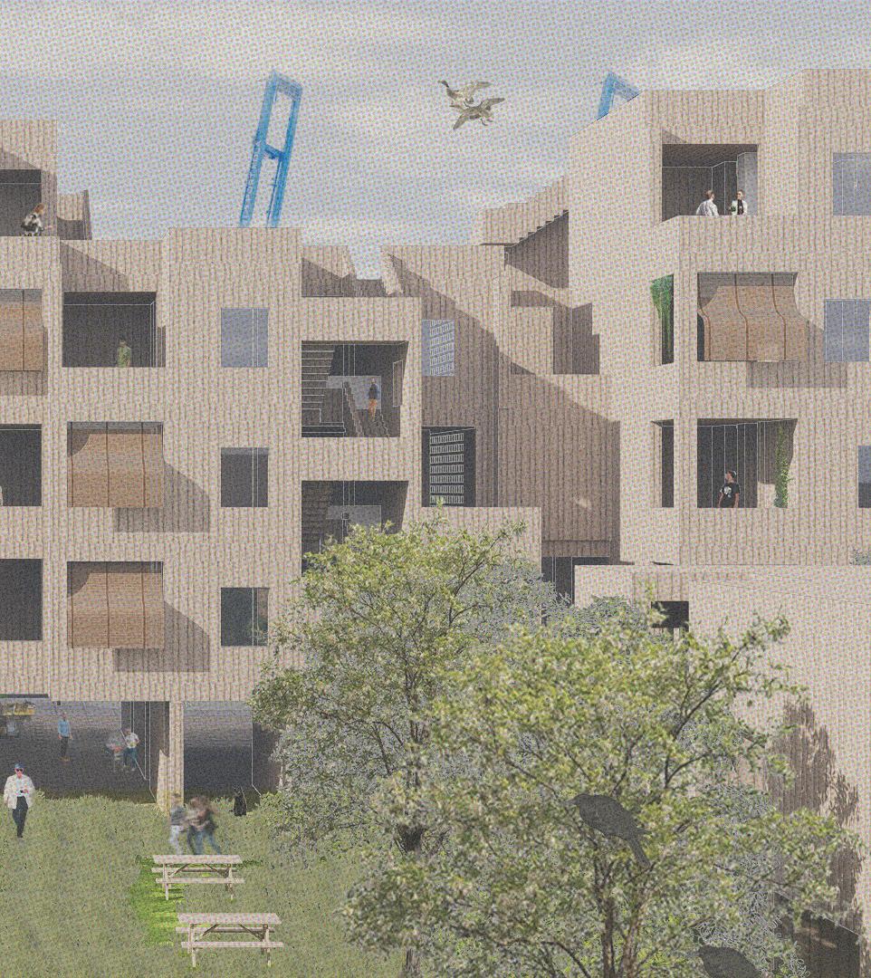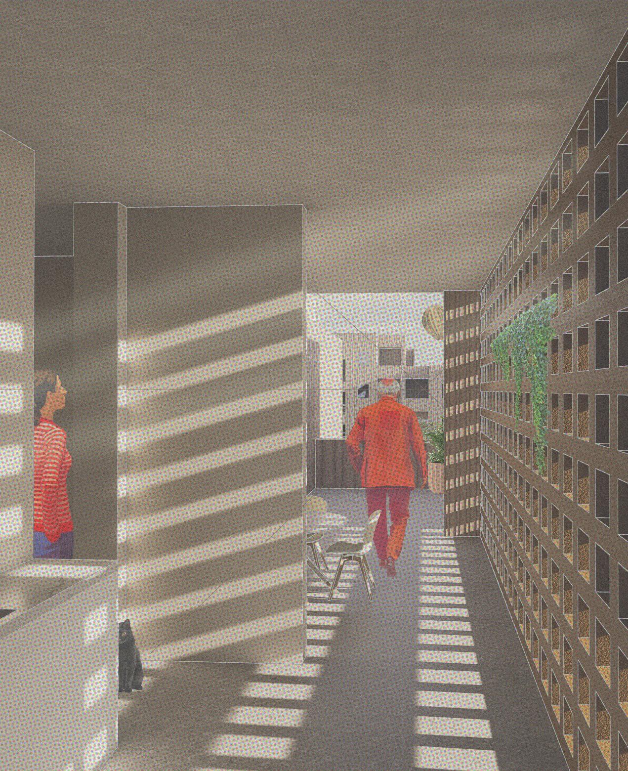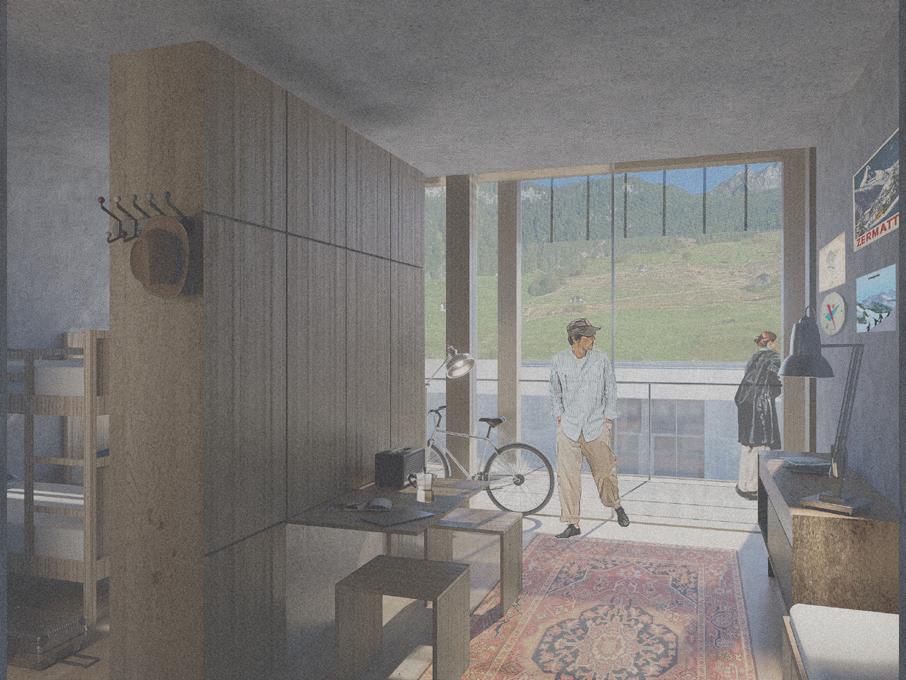 Two buildings and the space between create a ‘Swiss Plynth’, which houses program for the internal community and the greater Vals community. Facing the main road is a meticulously assembled, layered housing building with 108 units; 50% senior housing, and 50% medium-long term hostel units. The first two floors of the building serve both communities, with an affordable dining hall and canteen, lounge, and mediatheque. Outside, planter beds offer outdoor recreation for those interested. Across the site, by the river, emerges a monolith, dedicated to the health and wellness of community members of all ages, and citizens of Vals. The form and material of this monolith stems from the deep-rooted connection between wellness and the earth within the Swiss Alps.