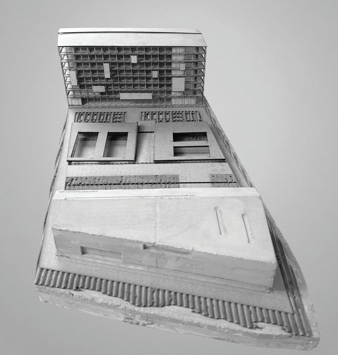 Throughout the process techniques of model making across materials and media were tested, and notions of composition, form, light, and shadow were applied and iterated, with many dry fits and tests before the final result was glued together.
